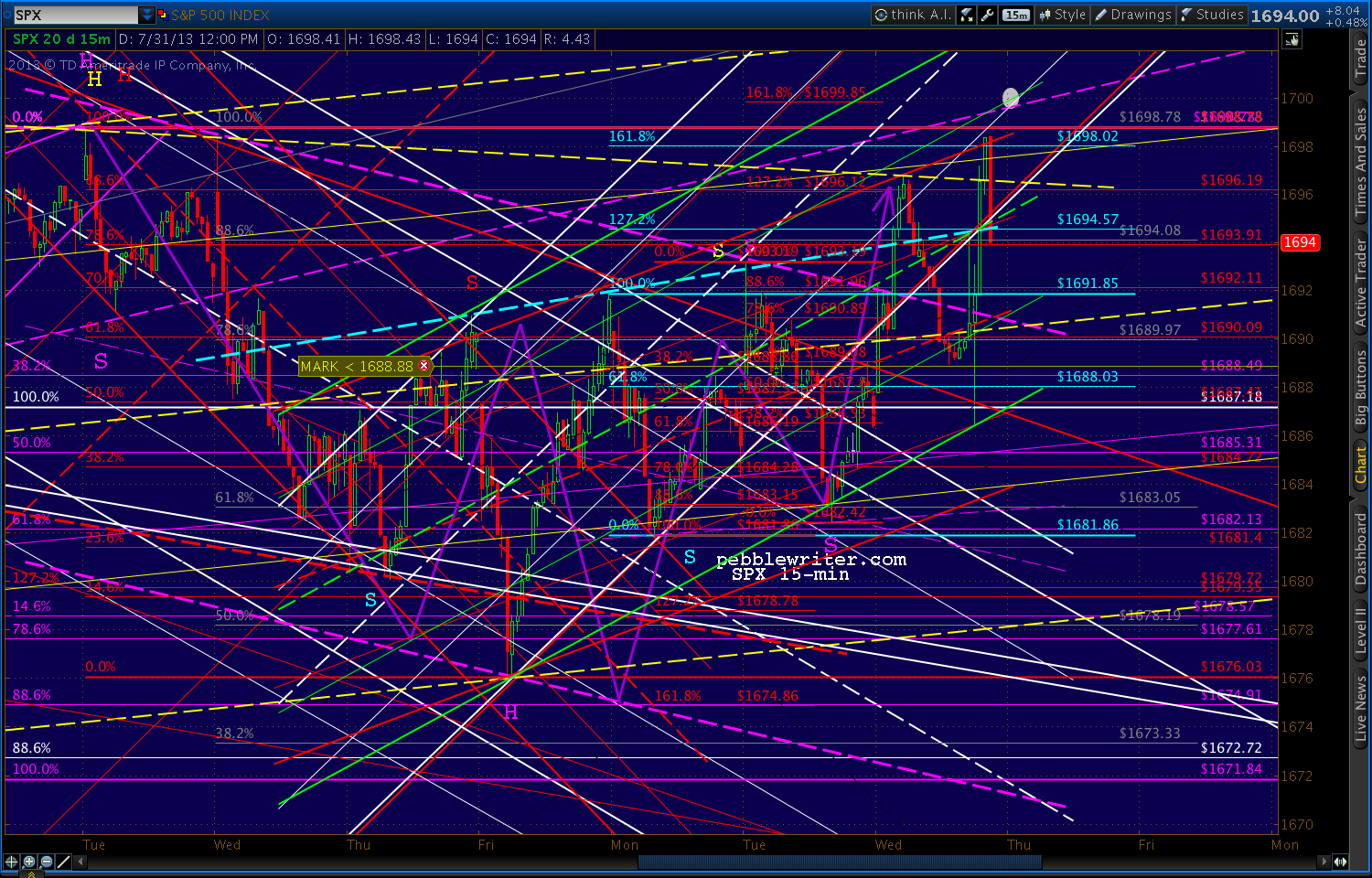 Currencies are looking for some action, and so far it looks like dollar strengthening — not necessarily good for stocks. I’ll start off short SPX today, preferably at 1690.89 or 1691.96.