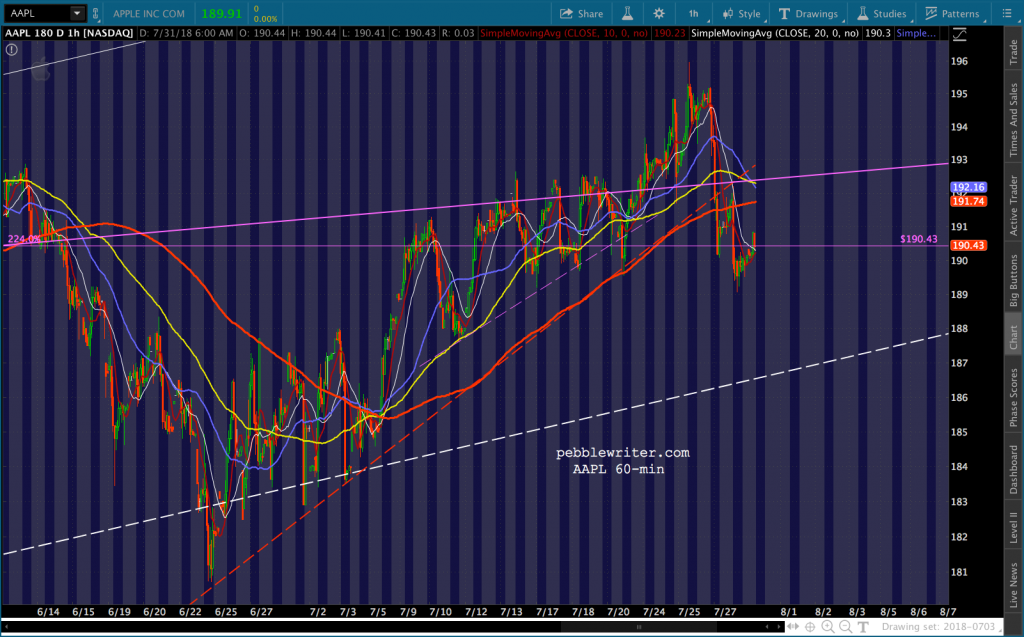 Zooming out, we can see that AAPL has a more serious problem than just the 2.24: the top of the rising purple channel which touched off the last major decline.