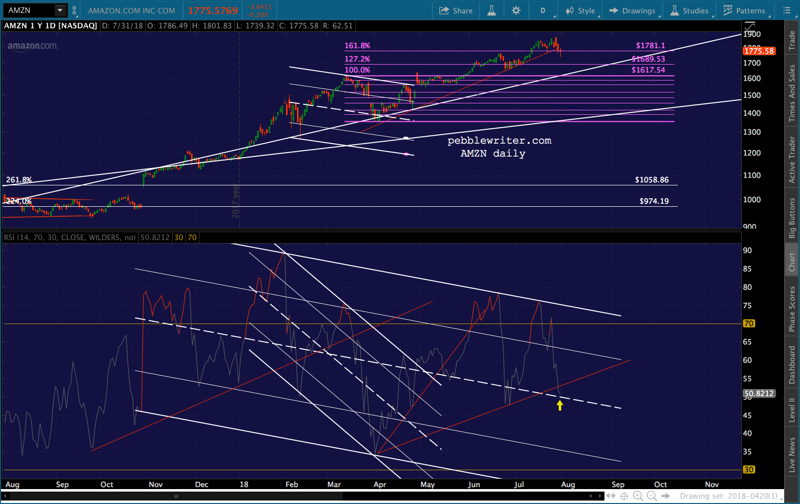 GOOGL has enjoyed a clean path forward since breaking out on May 9, coming within 7 points of our upside target at the 1.618 extension.