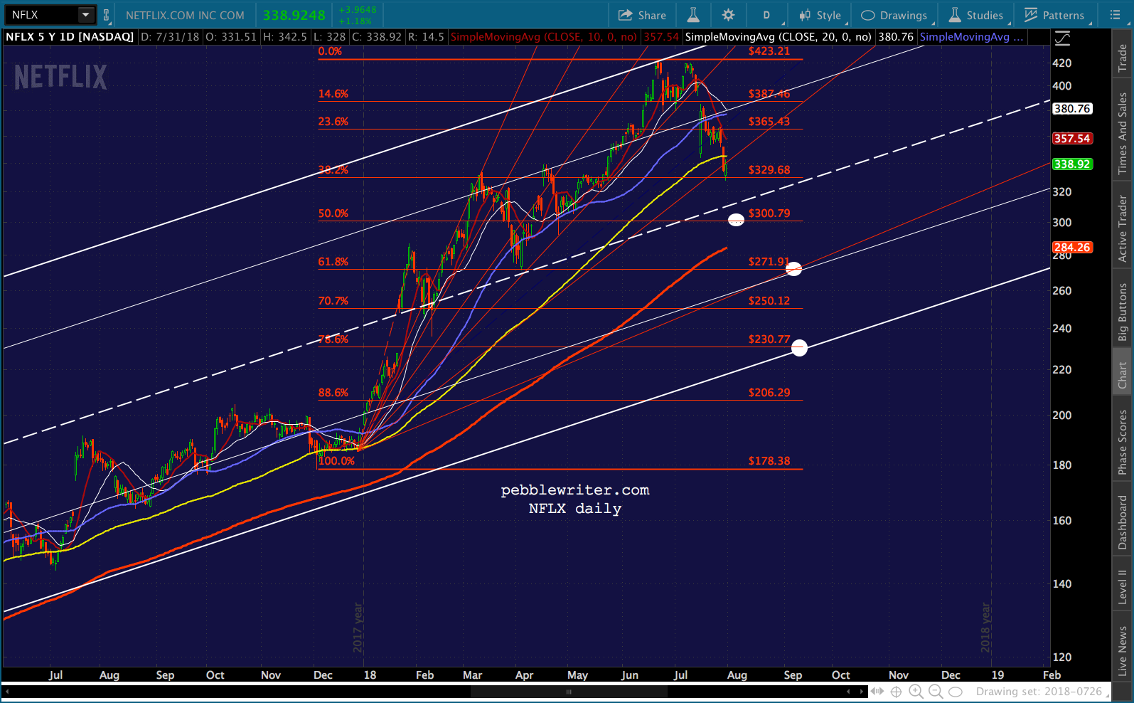 NFLX is also showing plenty of negative divergence and hasn’t much support nearby. The white channel midline and .500 Fib at 300.79 should help. But, note that the SMA200 is well below that at 284.26 – a 16% drop from here and 33% from recent highs.