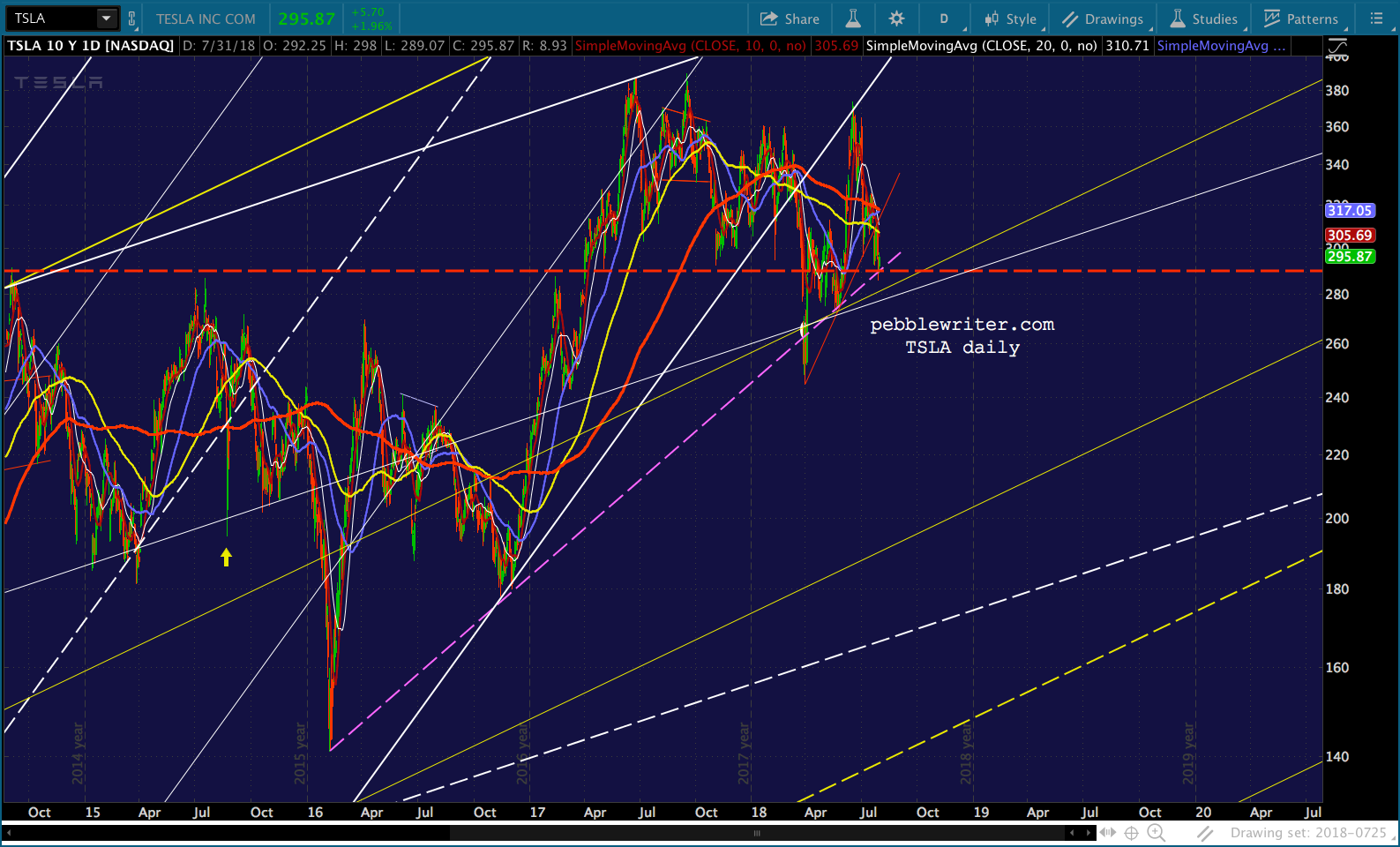 If it drops below the 2.24, the next serious support isn’t until the bottom of the rising white channel it’s been in since Mar 2016. Note that the SMA200 is right there on the channel bottom, currently at 176.22 — a 7.4% drop from current levels and 10% from its recent highs.