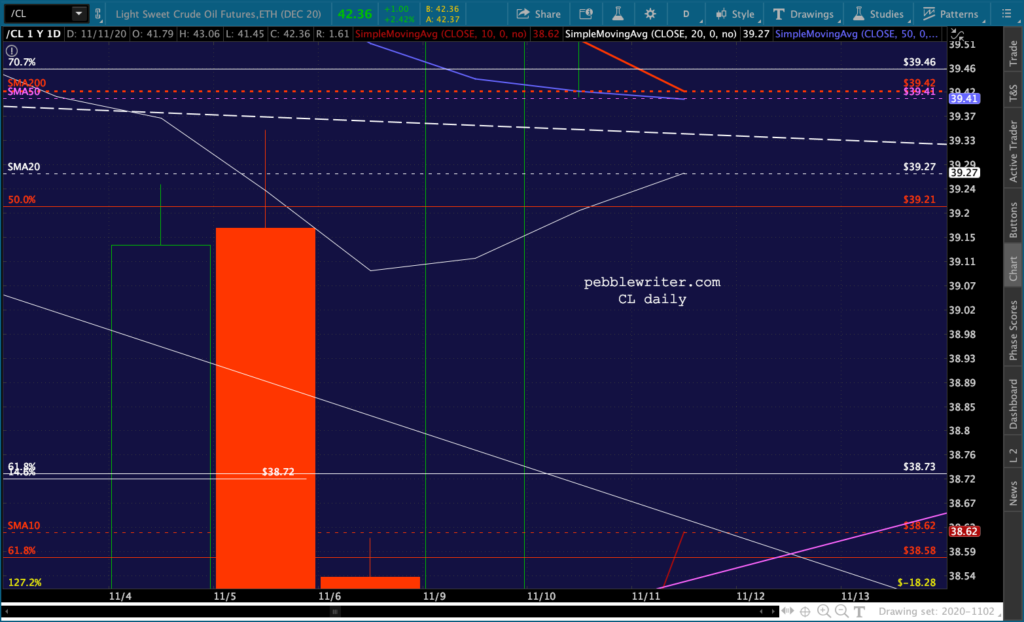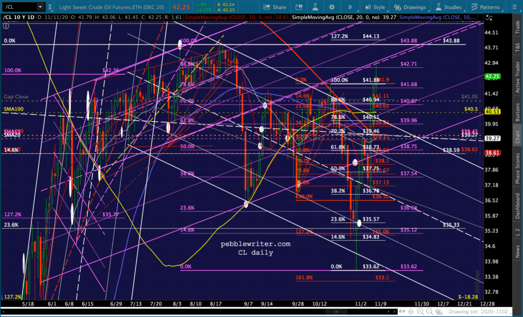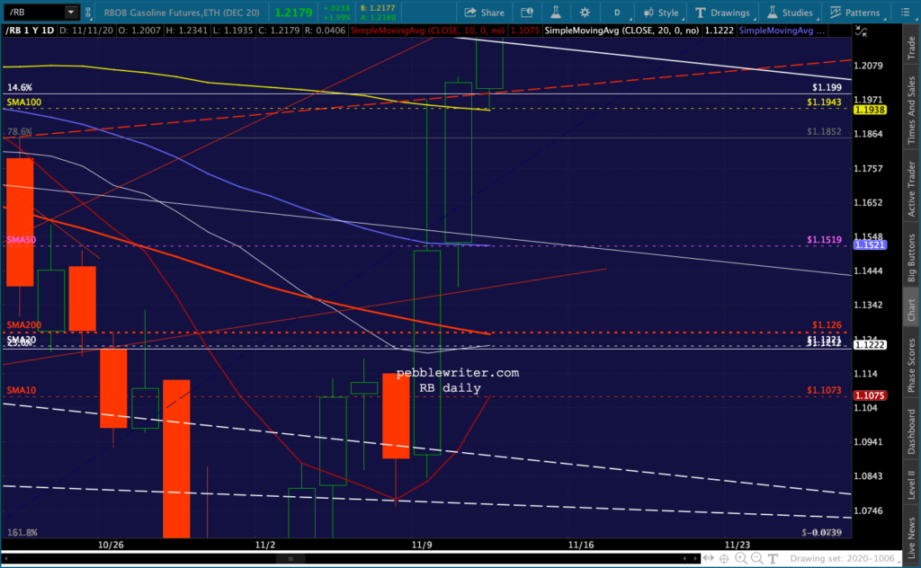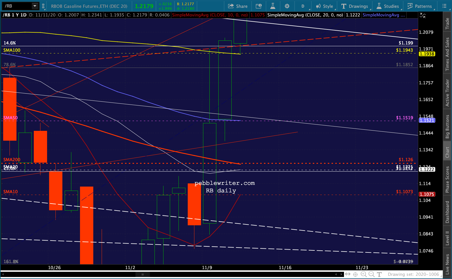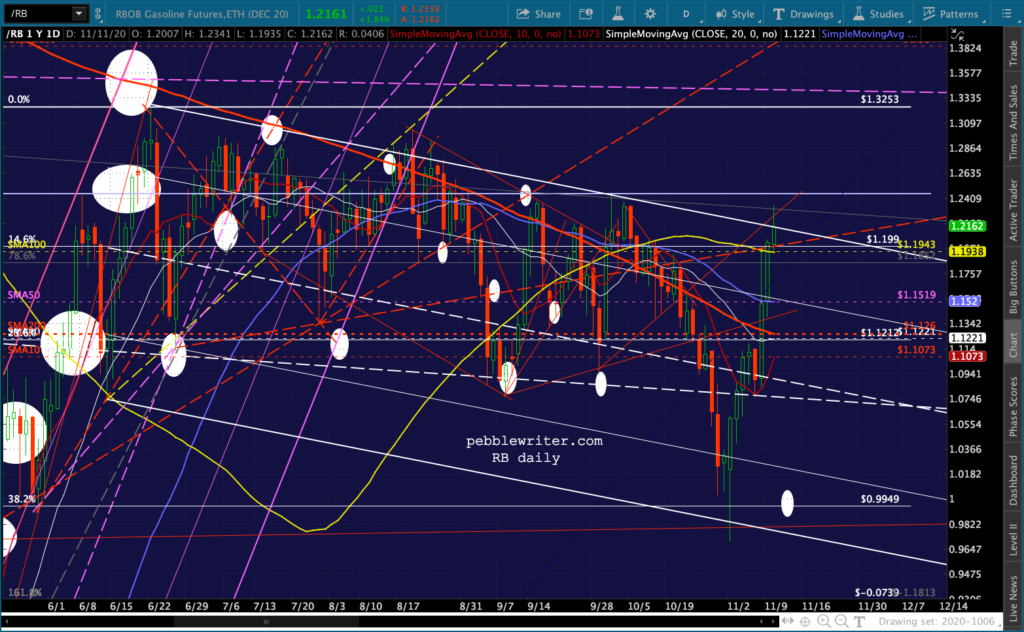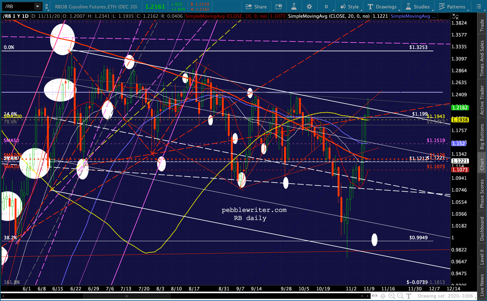 The biggest surprises among our charts have been CL and RB. CL’s falling white channel is shifting and it has regained the rising purple channel. The EIA inventory data won’t be released until tomorrow due to the holiday.