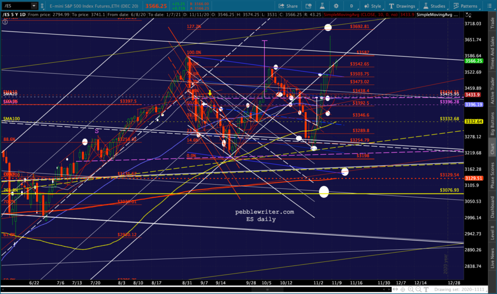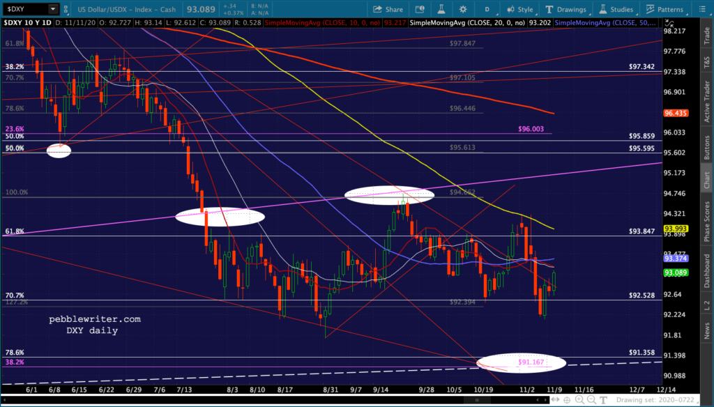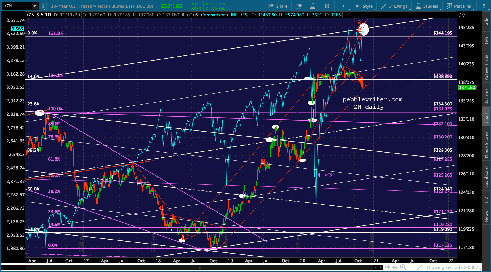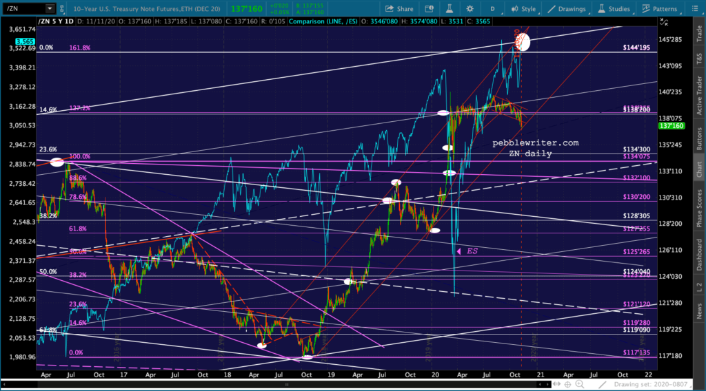 Note that this is ES’ fifth crack at backtesting its broken white channel. The previous incursions didn’t last. So, the picture remains just muddled enough to leave multiple paths open.