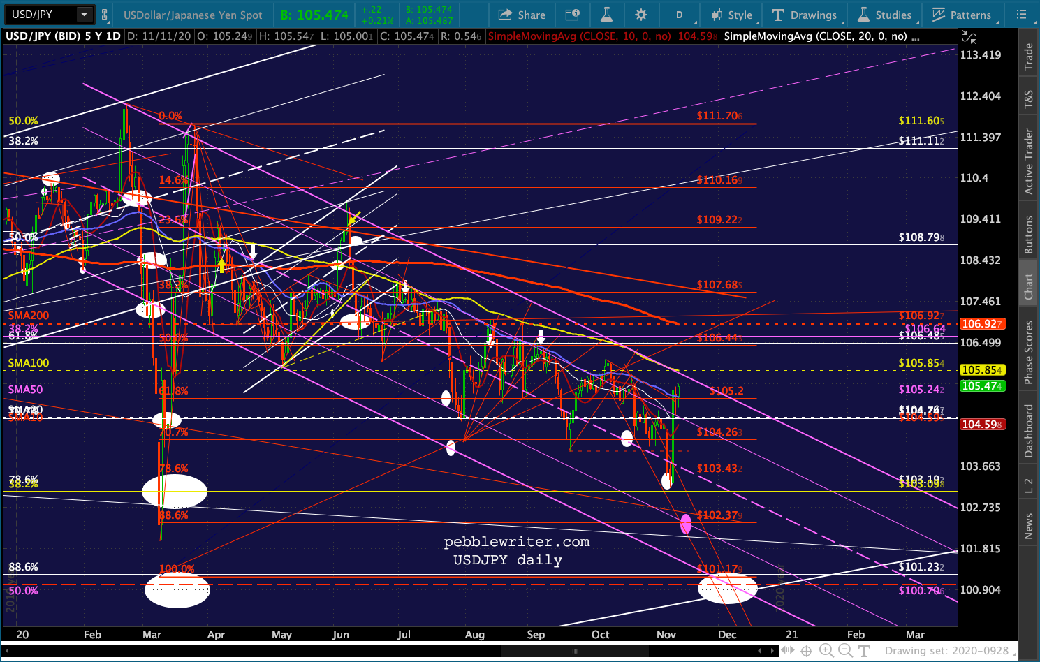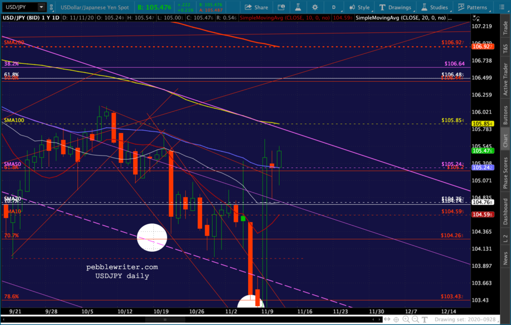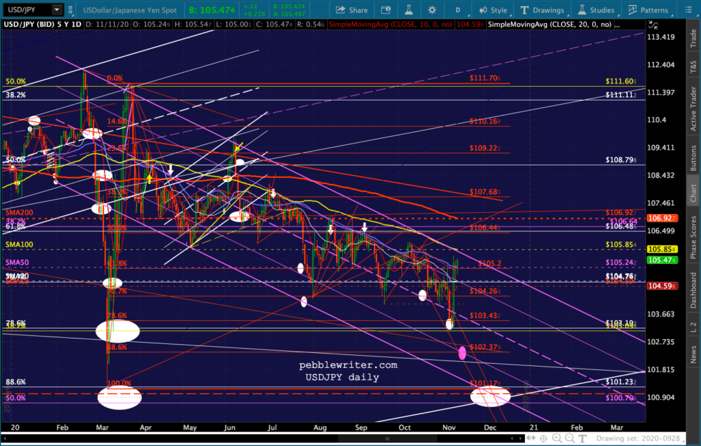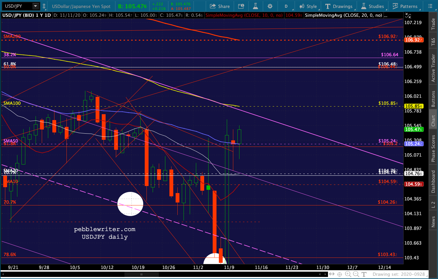 USDJPY is threatening a bullish 10/20 cross and is nearing the top of its falling purple channel…