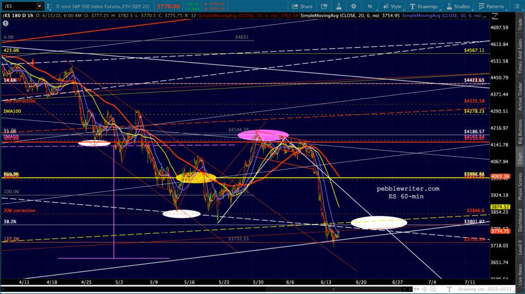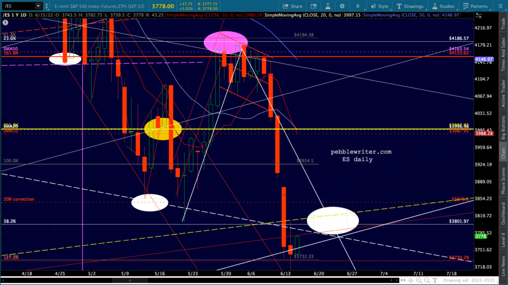 continued for members…At this point, ES is still backtesting the falling white channel midline (3793ish) and might easily push past it to the yellow midline (3812ish.)
