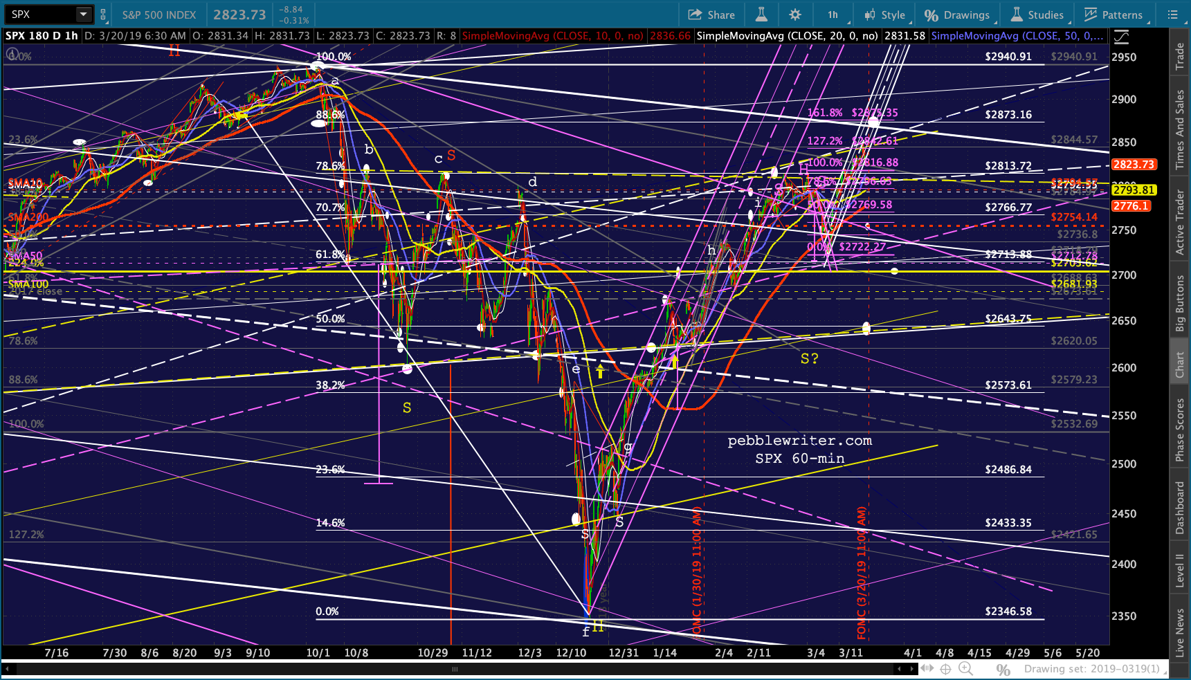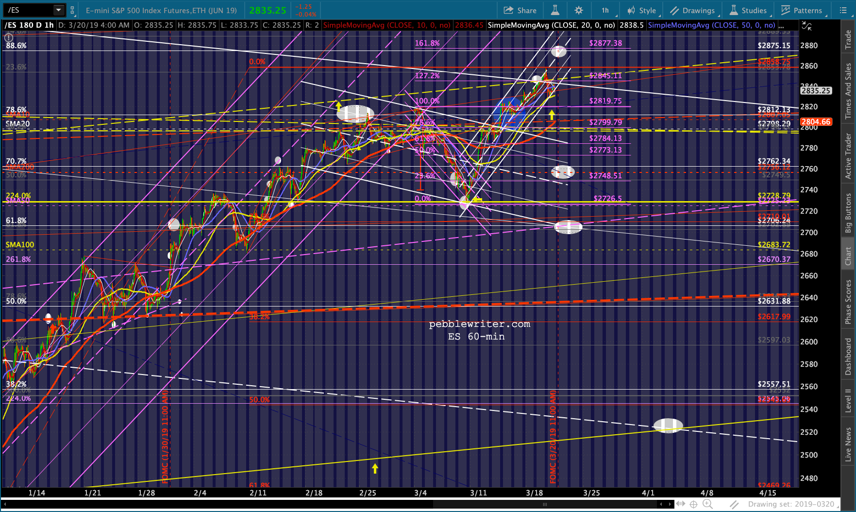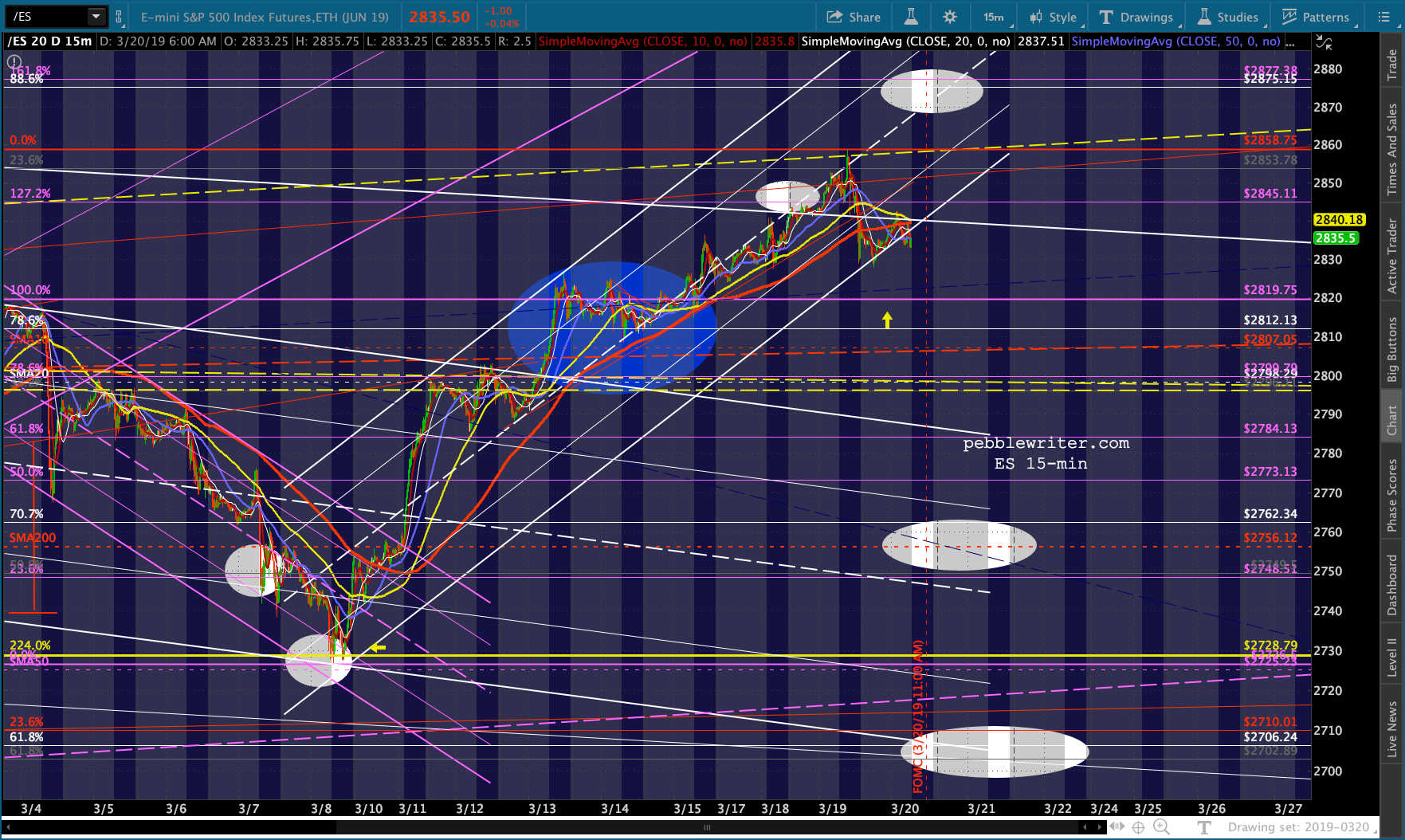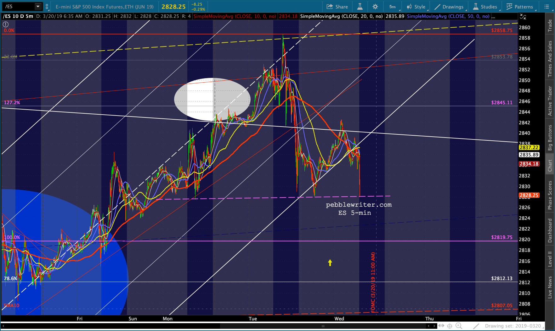 ES just reached its first real test – the neckline of a little H&S targeting 2800 – the location of the SMA20, purple .786 and two different channel midlines.