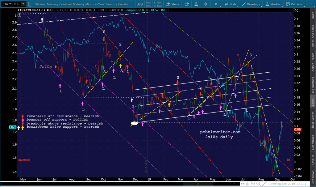 And, the 2s10s has reversed off of overhead resistance, a bearish development — as is the breakout above the steep yellow TL.