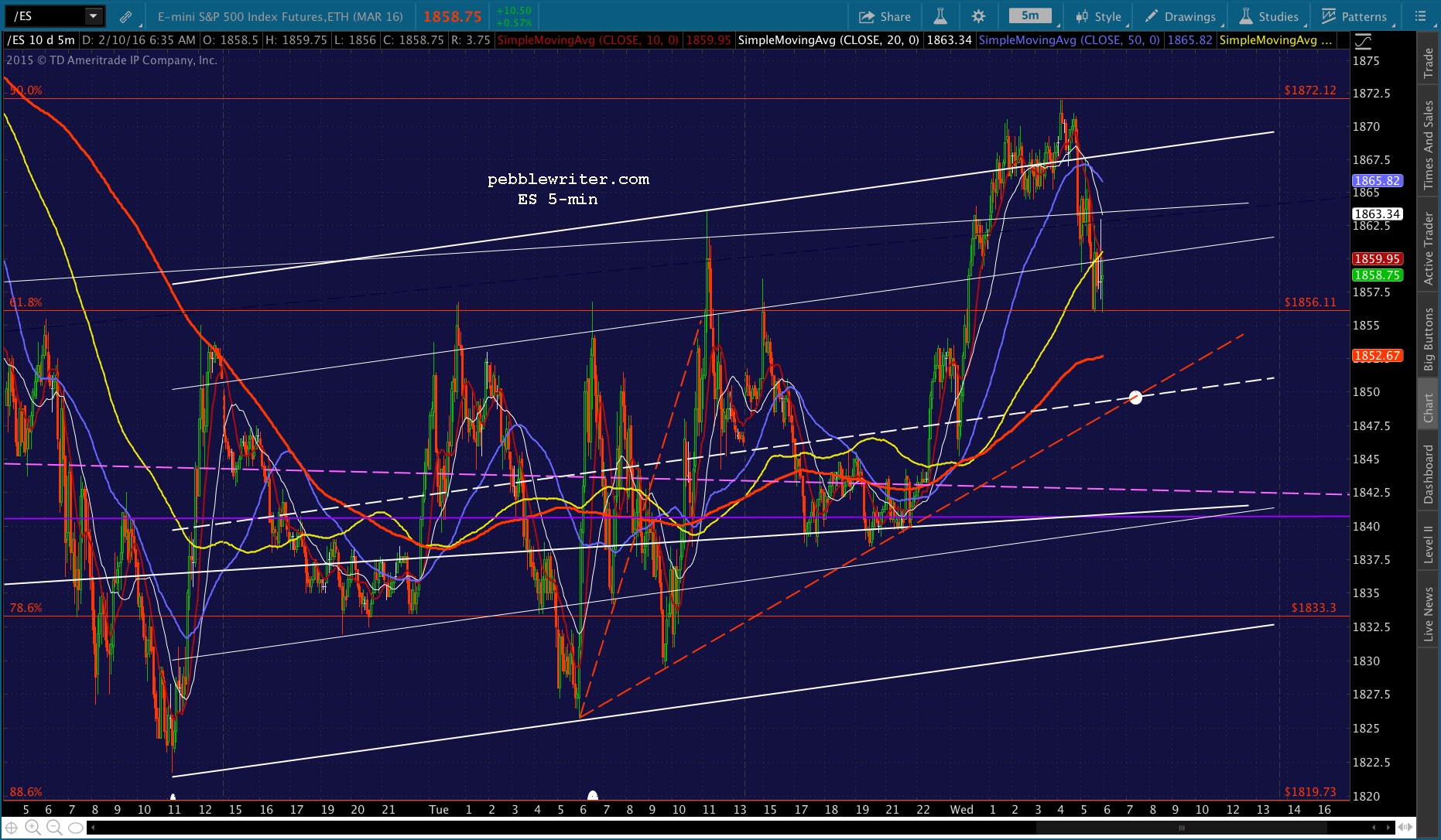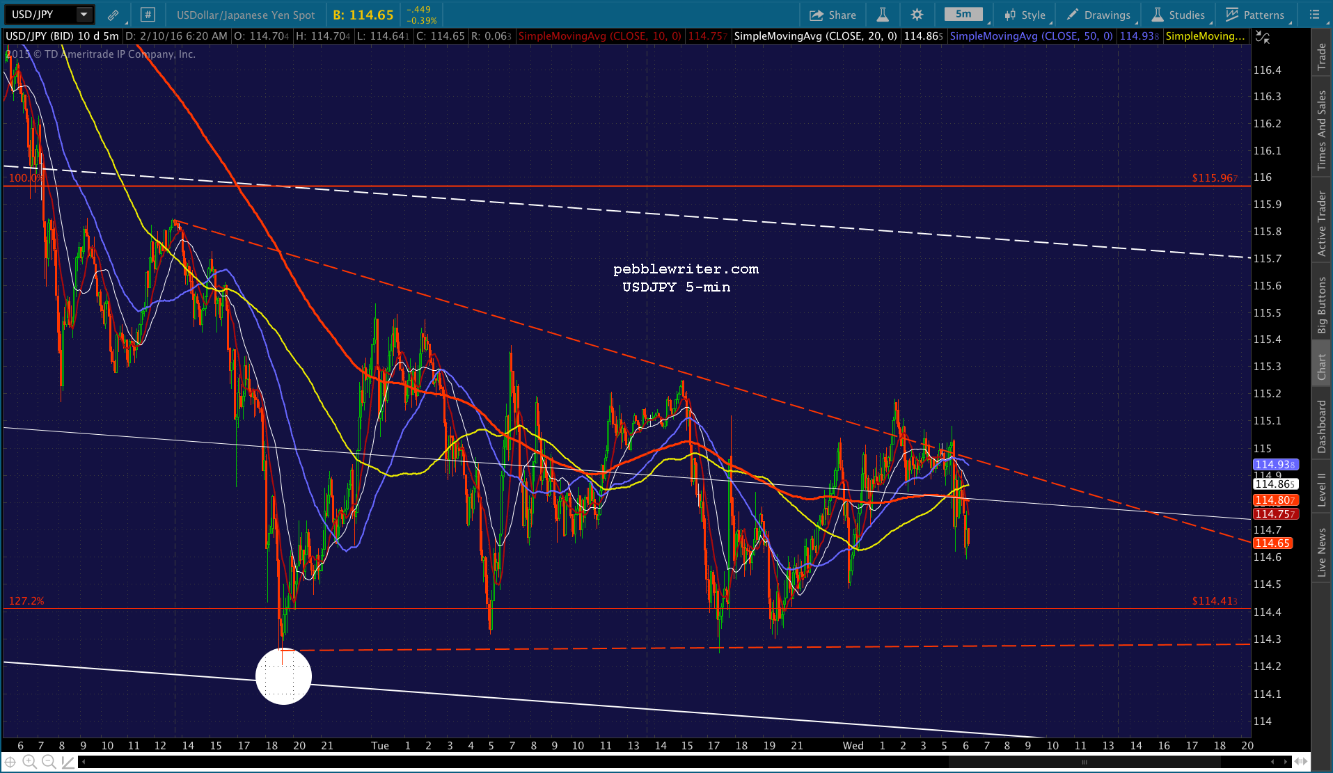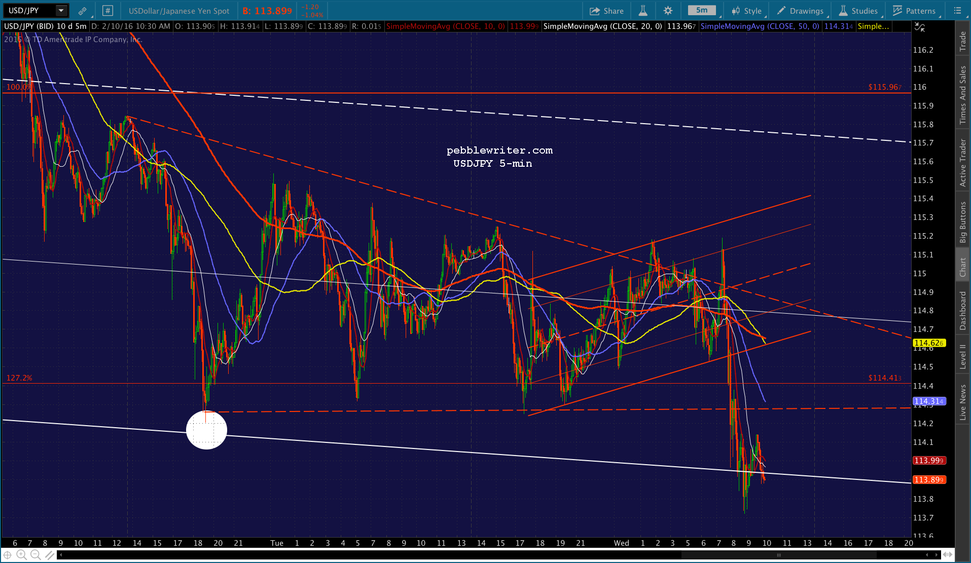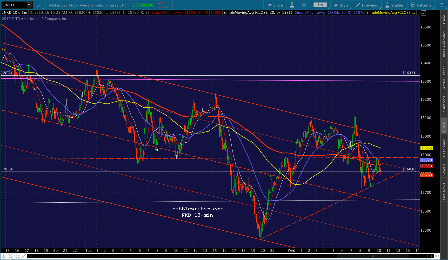 I’d short here at 1867.63 for a drop to the purple channel midline around 1859 — also the SMA5 100. If that fails, then the SMA200 at 1850ish — also the falling white channel midline — is the next support. Tight stops are advised, as USDJPY and CL are both providing support and NKD hasn’t yet broken down.