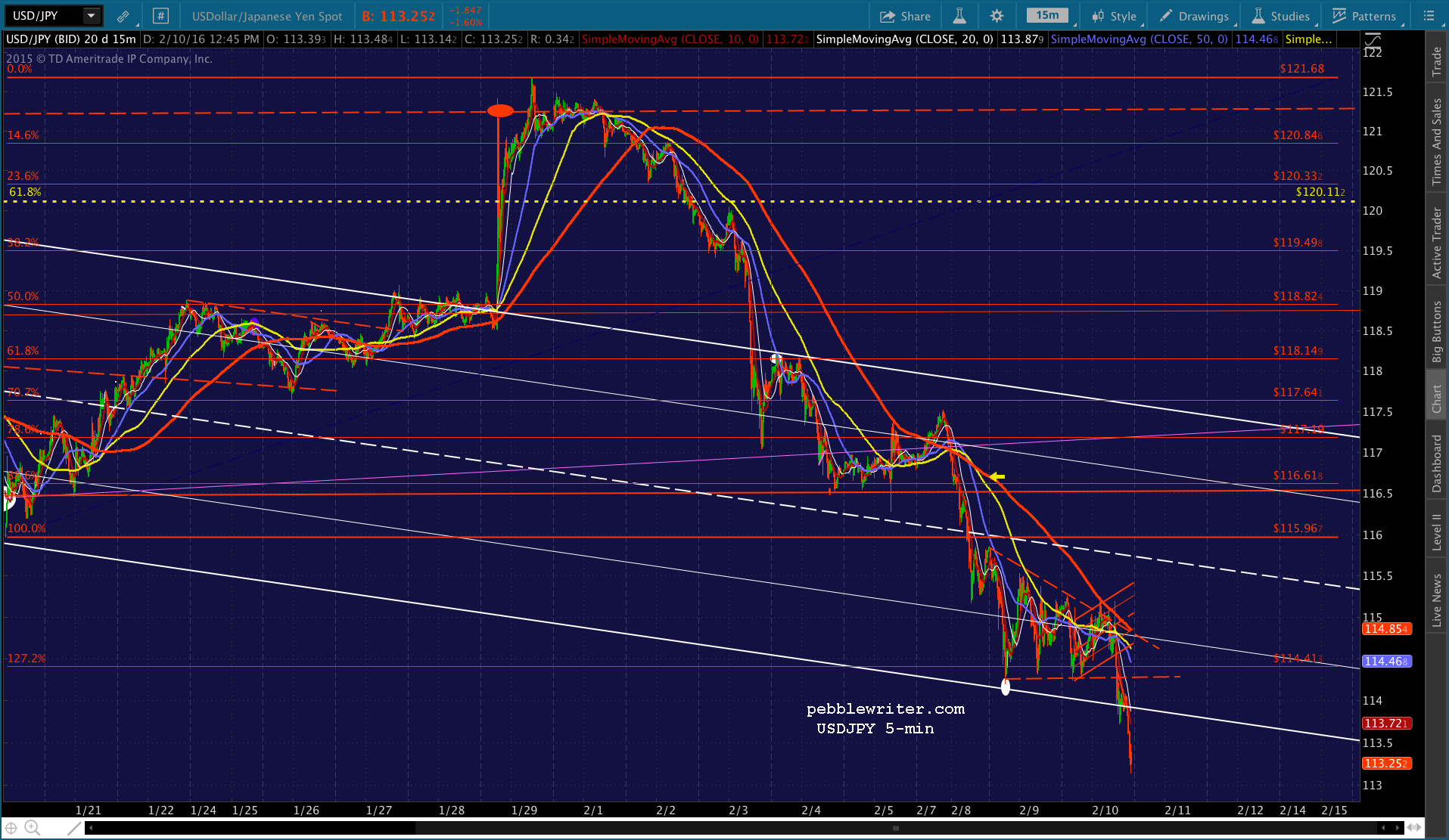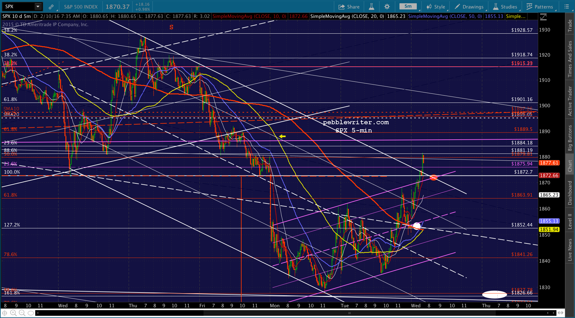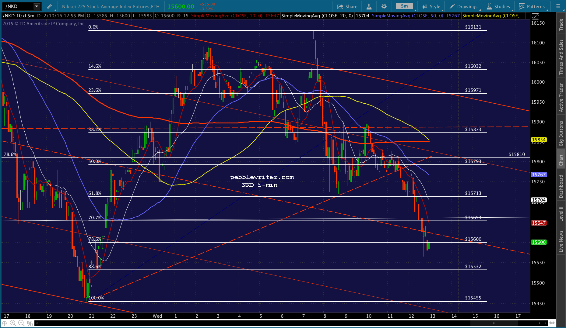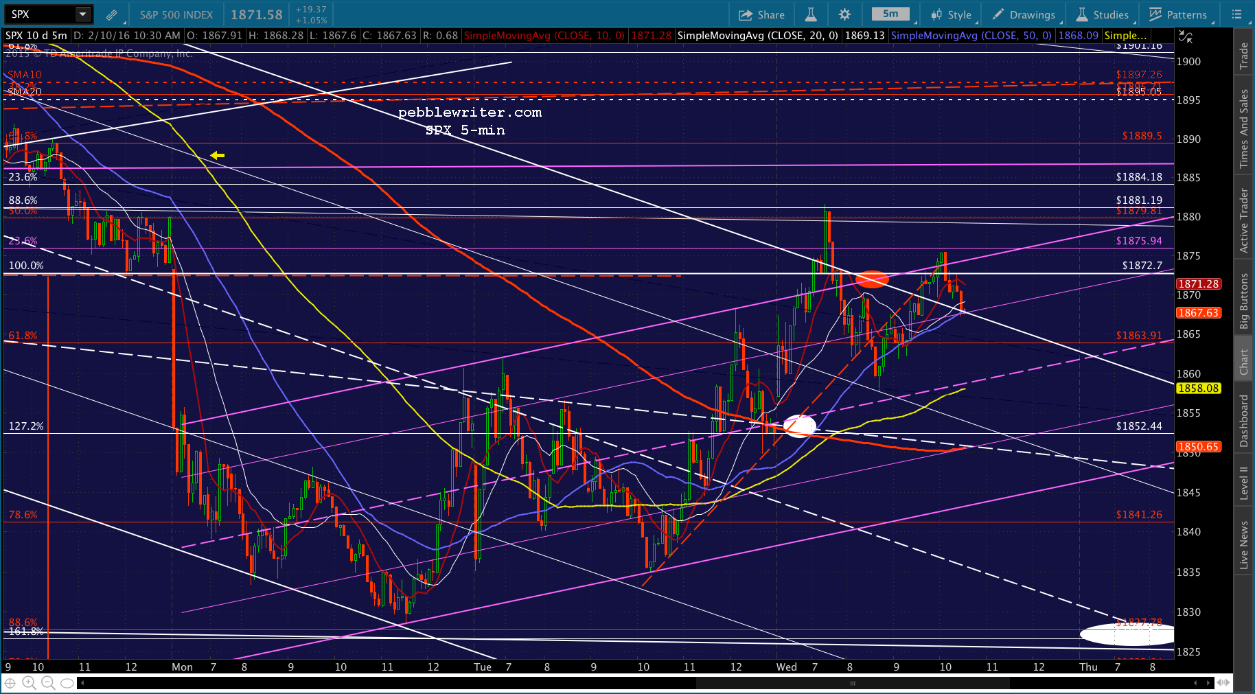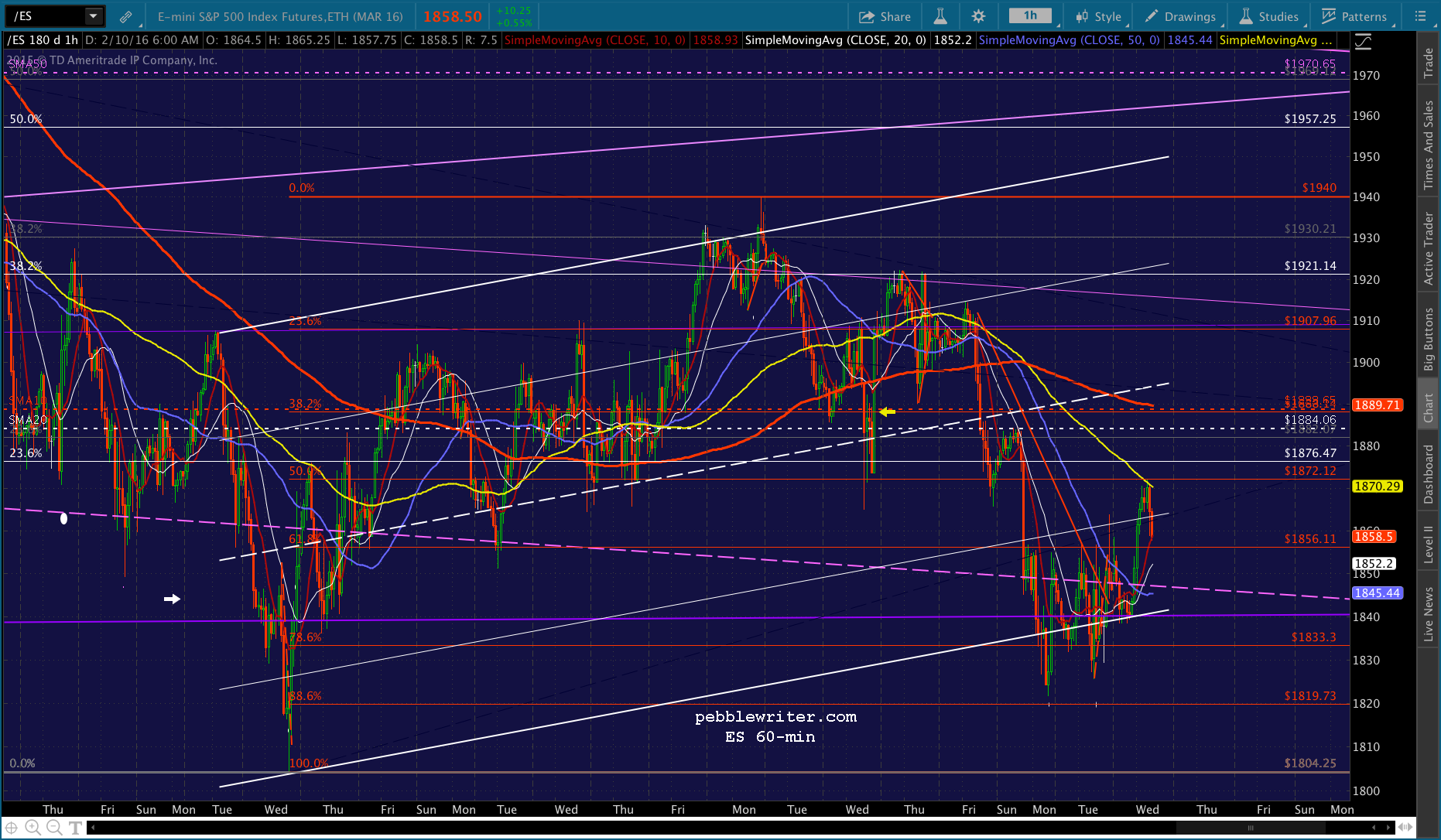 I’d short here at 1867.63 for a drop to the purple channel midline around 1859 — also the SMA5 100. If that fails, then the SMA200 at 1850ish — also the falling white channel midline — is the next support. Tight stops are advised, as USDJPY and CL are both providing support and NKD hasn’t yet broken down.