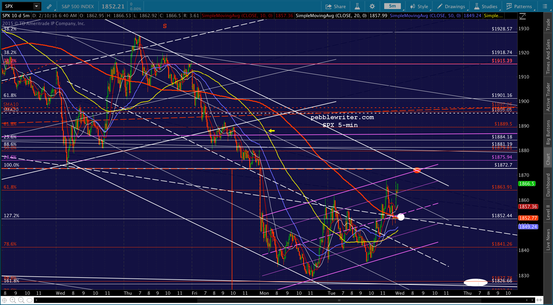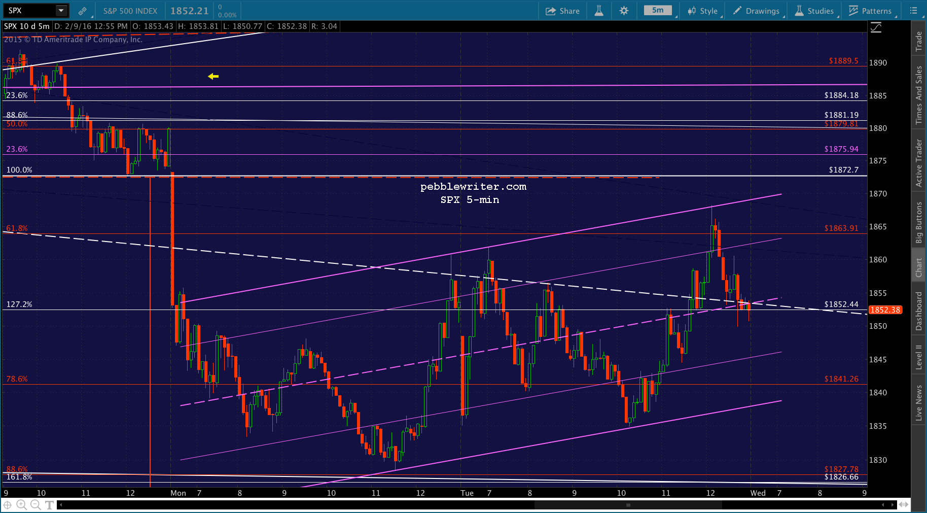 SPX should get an initial bump to match the futures, and after that I suspect it’ll be all algos all day. If CL and NKD dip below their support and USDJPY tests the triangle base, SPX should dip to the white channel midline and SMA5 200 around 1852.44.