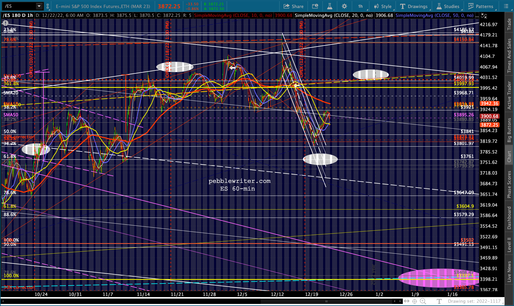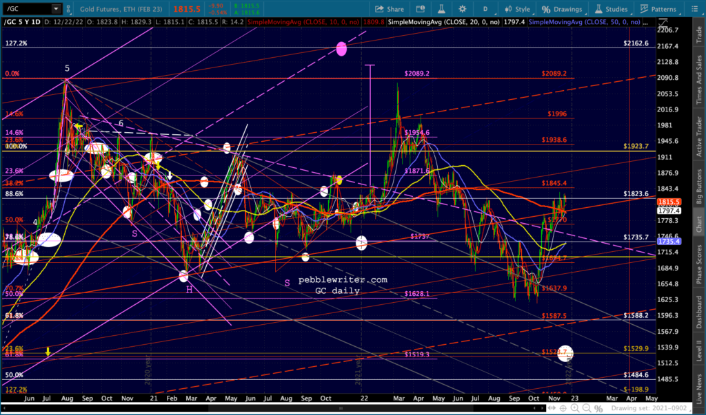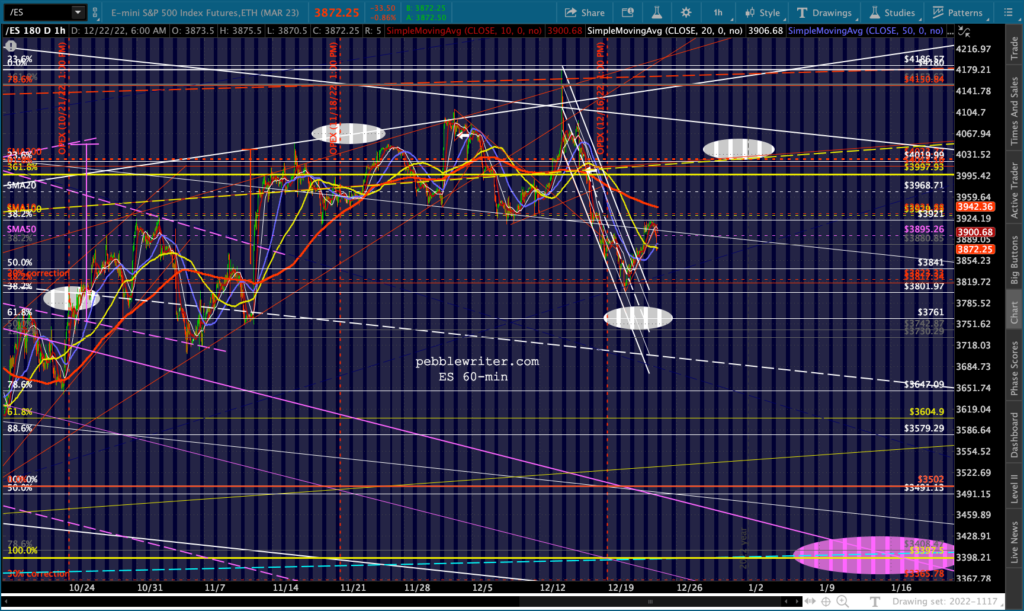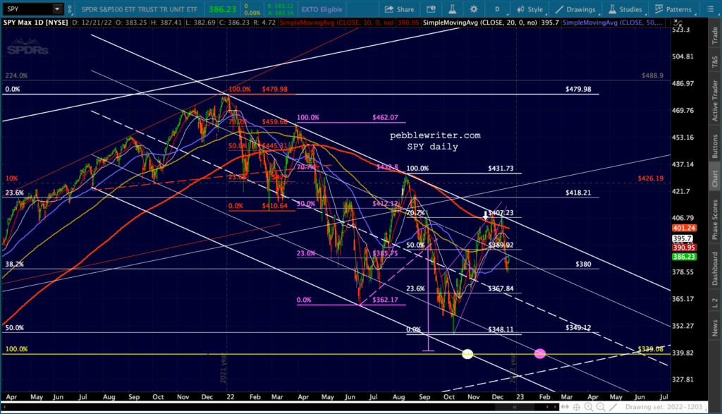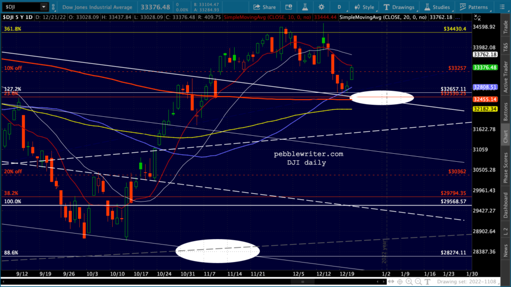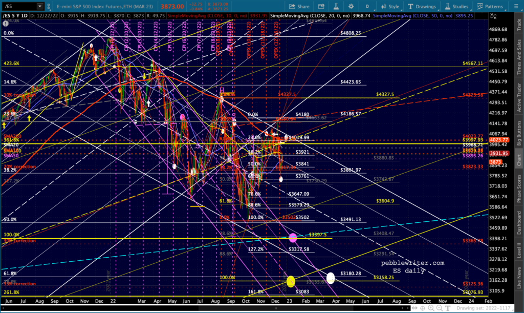The Dow’s need to tag its SMA200 (32,451.84) is both the bears’ opportunity and their challenge. Once it’s reached, will there be a huge effort to hold it? Perhaps. Assuming there’s at least a bounce, will it drag SPX/ES/COMP/SPY out of their bearish channels? Perhaps. I expect the Dow’s tag to be more important than ES reaching the .618 at 3761.
