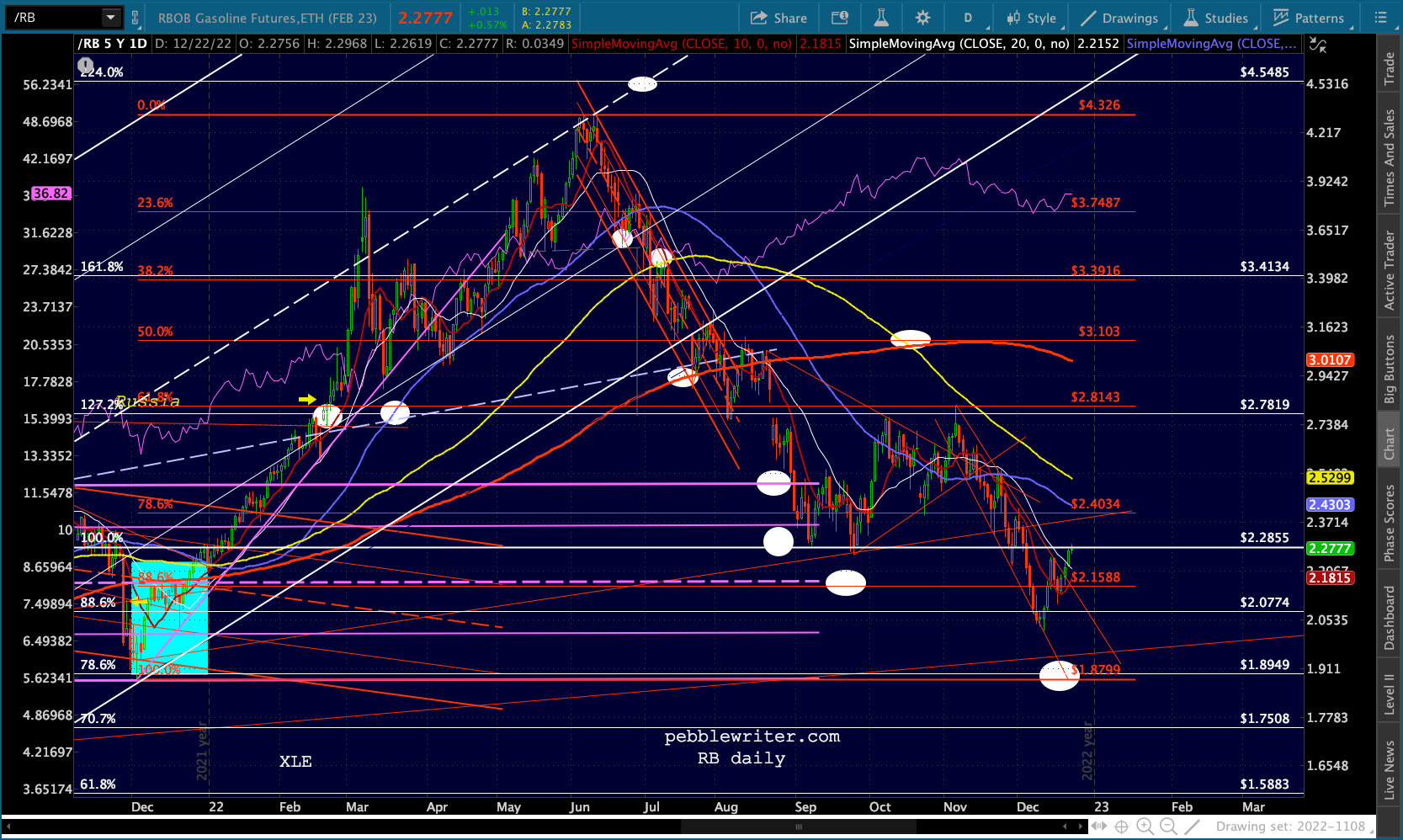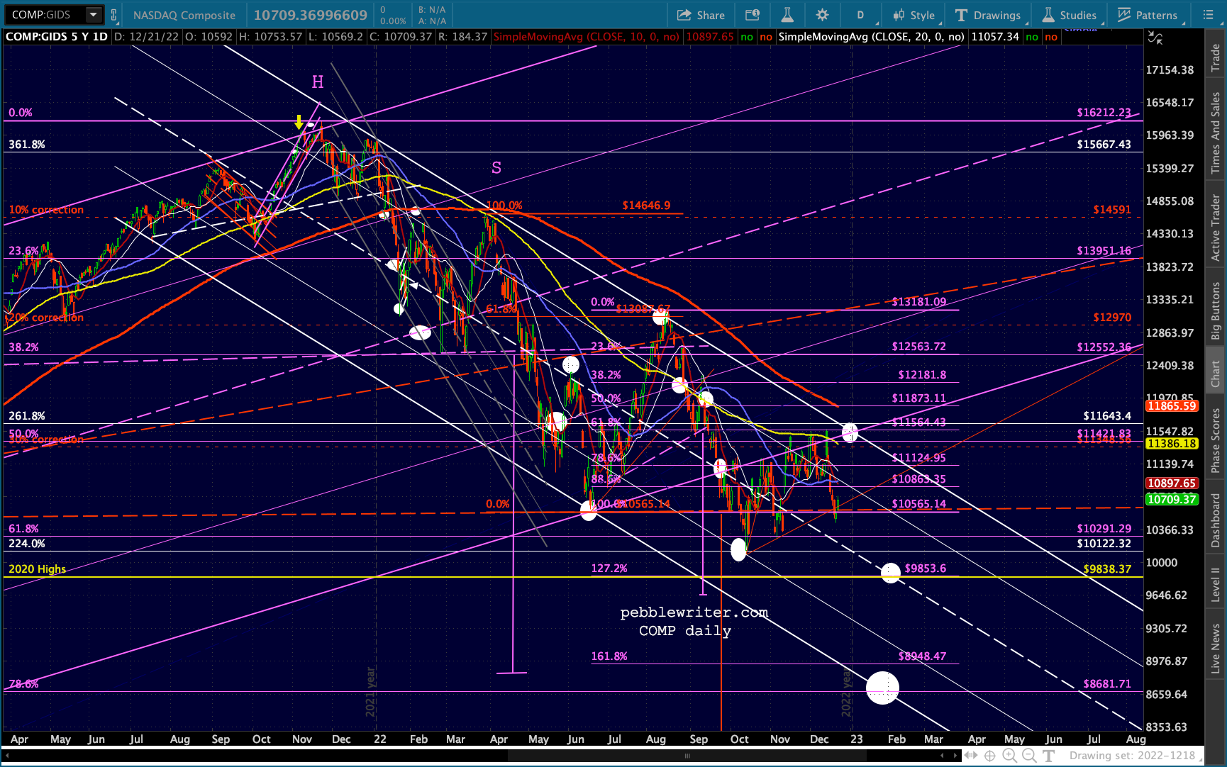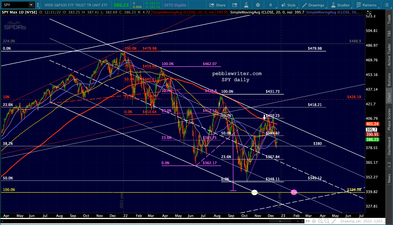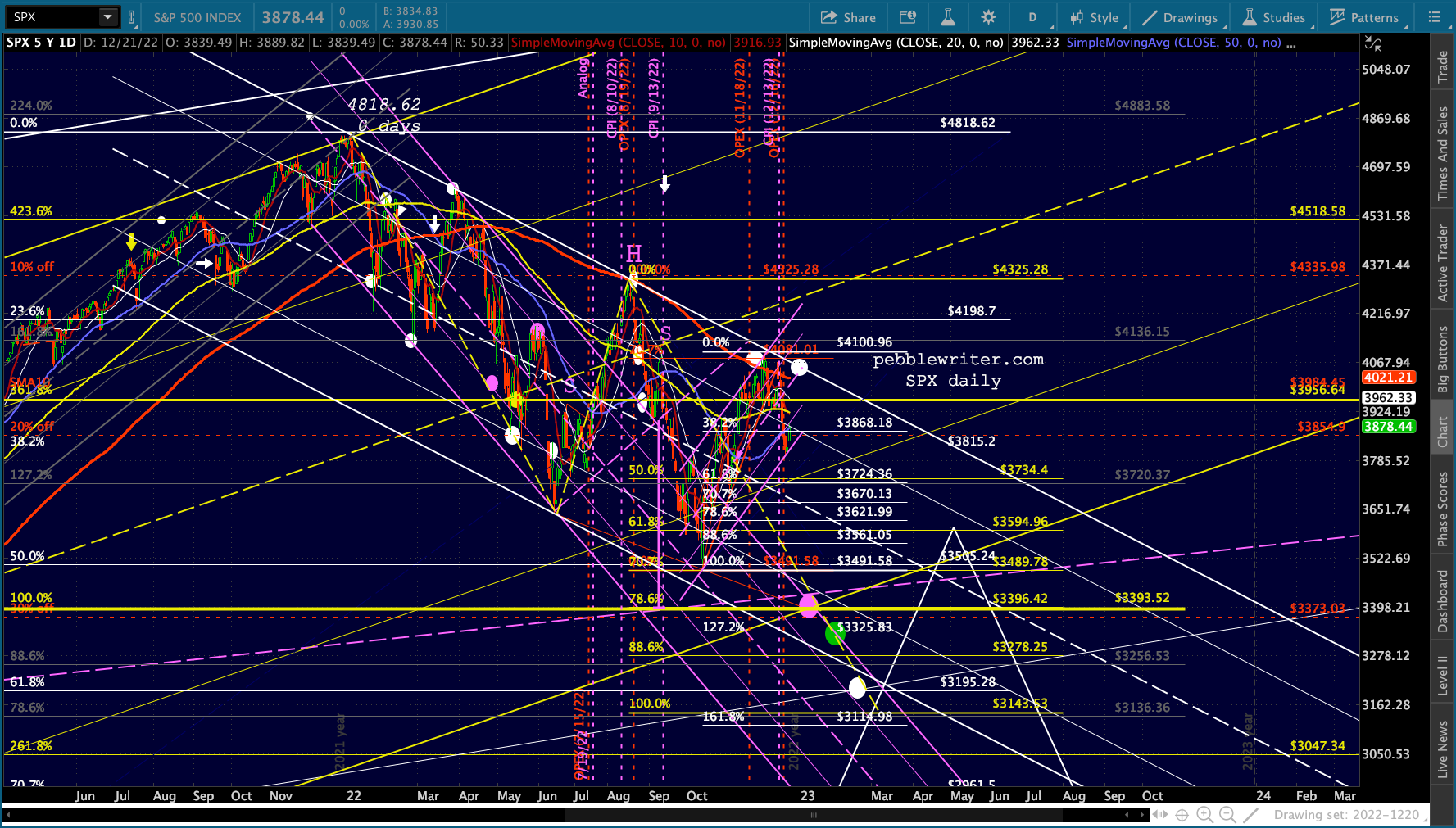 The Dow’s need to tag its SMA200 (32,451.84) is both the bears’ opportunity and their challenge. Once it’s reached, will there be a huge effort to hold it? Perhaps. Assuming there’s at least a bounce, will it drag SPX/ES/COMP/SPY out of their bearish channels? Perhaps. I expect the Dow’s tag to be more important than ES reaching the .618 at 3761.