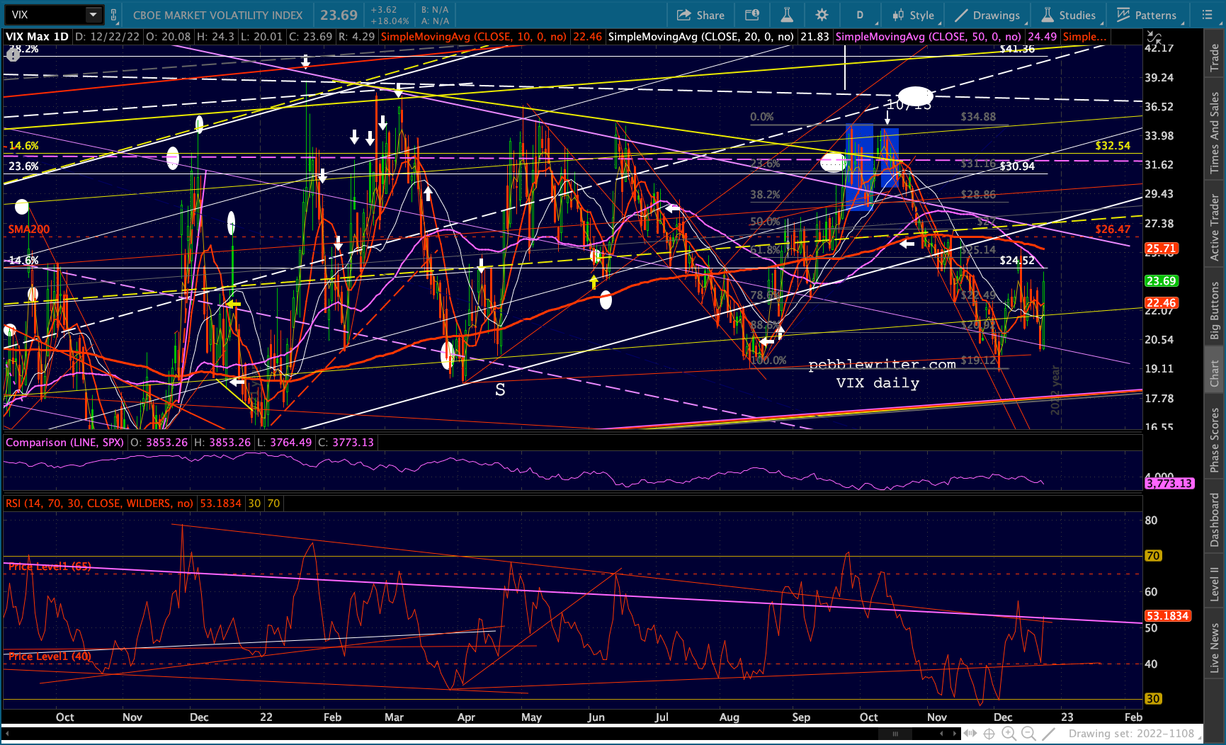 Remember, DJIA saw a golden cross the other day, so the bulls might really be hoping/planning to cling to that positive momentum. And, even though it’s getting a nice bounce today, VIX hasn’t reached its own SMA200 at 25.71 or even its SMA50 at 24.49.