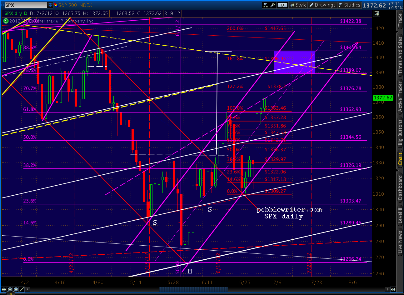 By now, everyone is familiar with the purple channel we’ve been in since the 1266 lows on June 4. I’ve also talked about the possibility of a rising wedge coming into play — the dashed purple trend line cutting across the tops made the past 5 weeks or so.