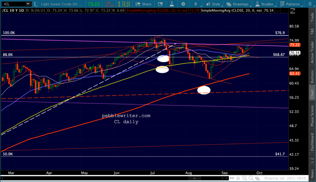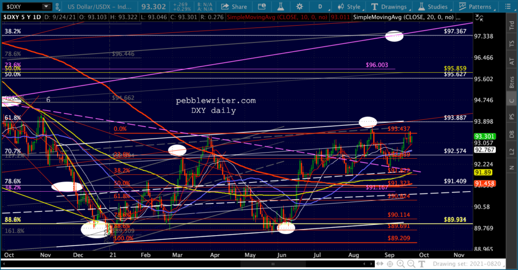 Put it all together, throw in some trend lines and other chart patterns, and we get a pretty clear picture that GC is on the verge of a breakdown. The chart doesn’t necessarily tell us which way it will ultimately go, just that we’re at an important juncture – very useful information indeed.