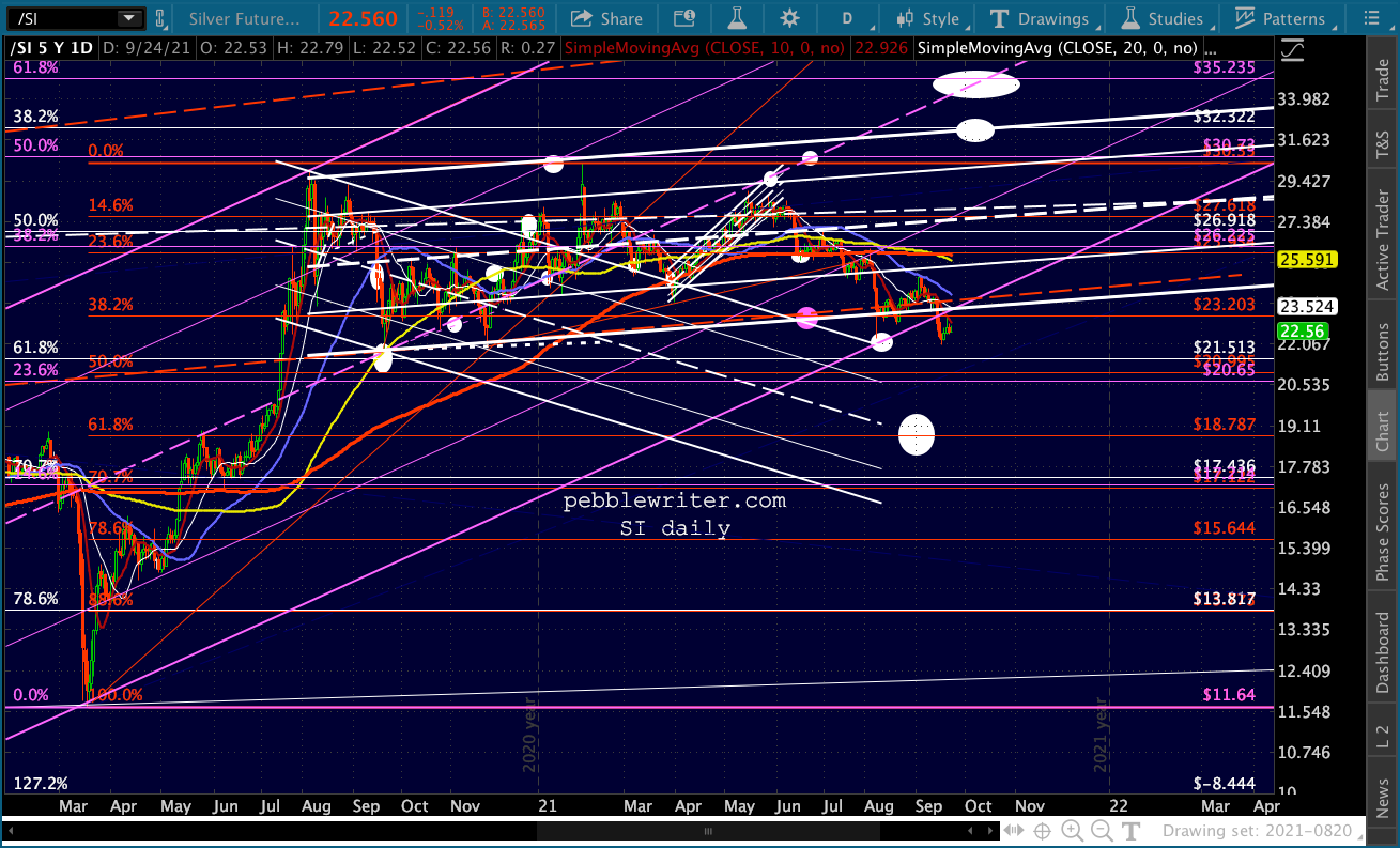 When GC rallied out of that falling red channel – a clear buy signal – we were able to construct a less bearish falling purple channel that guided prices for several more years. When GC reached the bottom of that channel, it accurately signaled a good buying opportunity. That signaled was reinforced when, in 2019, GC broke out of it.