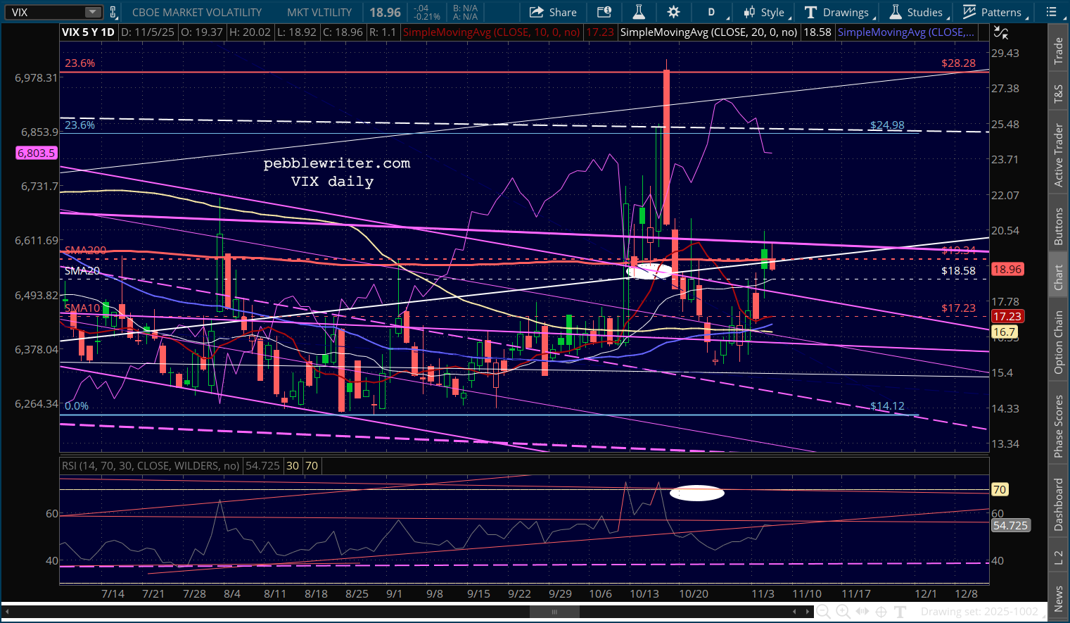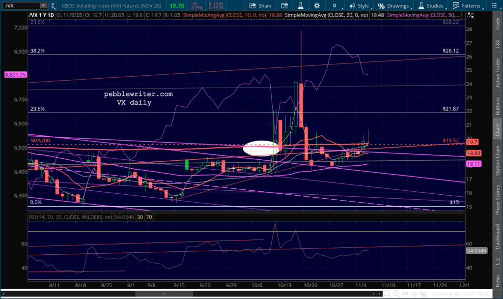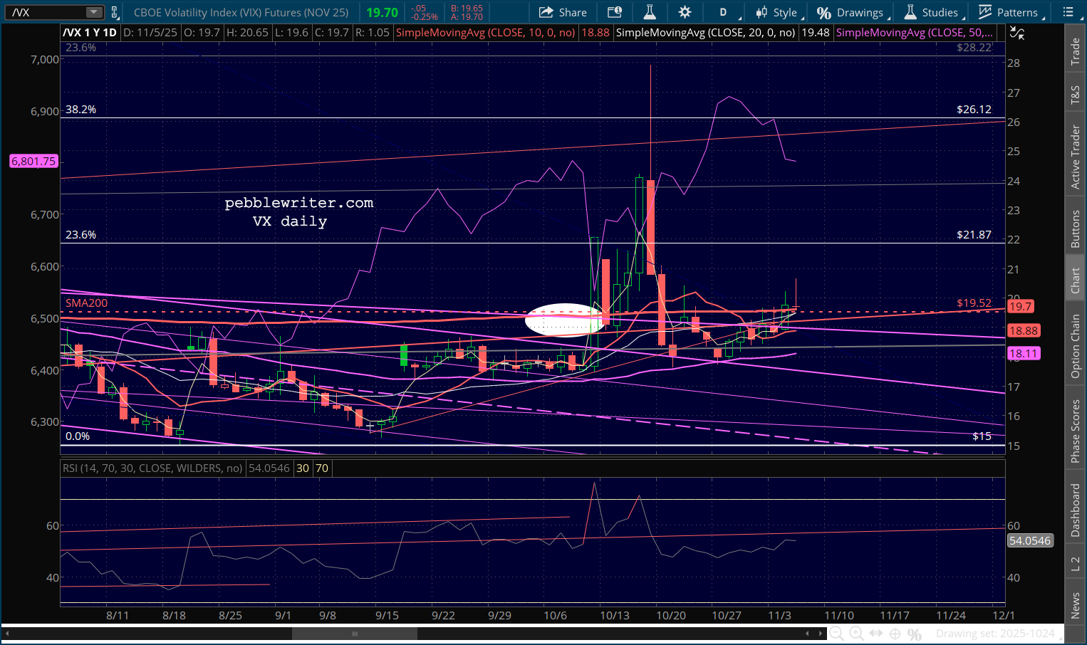 VIX made it above the SMA200 for just a bit before being slammed yet again, but it has joined VX in breaking out of its falling purple channel. Moment of truth for vol.