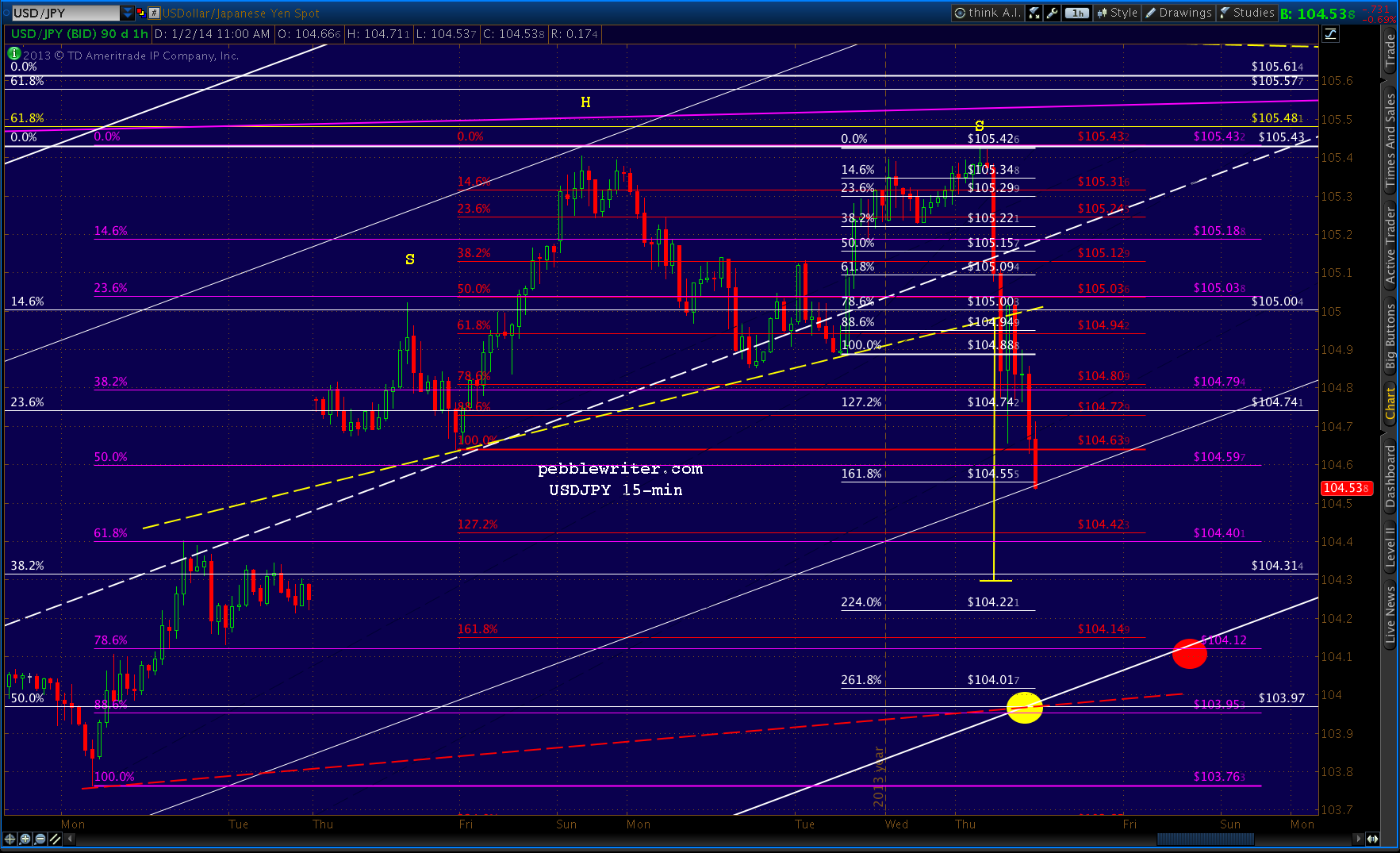 Look for the slide to continue, targeting the gap close at 104.33? But, that’s just the purple .618. The purple .786 or .886 take the pair all the way to the channel bottom and make for a more interesting first day at a decline of 1.31-1.46.