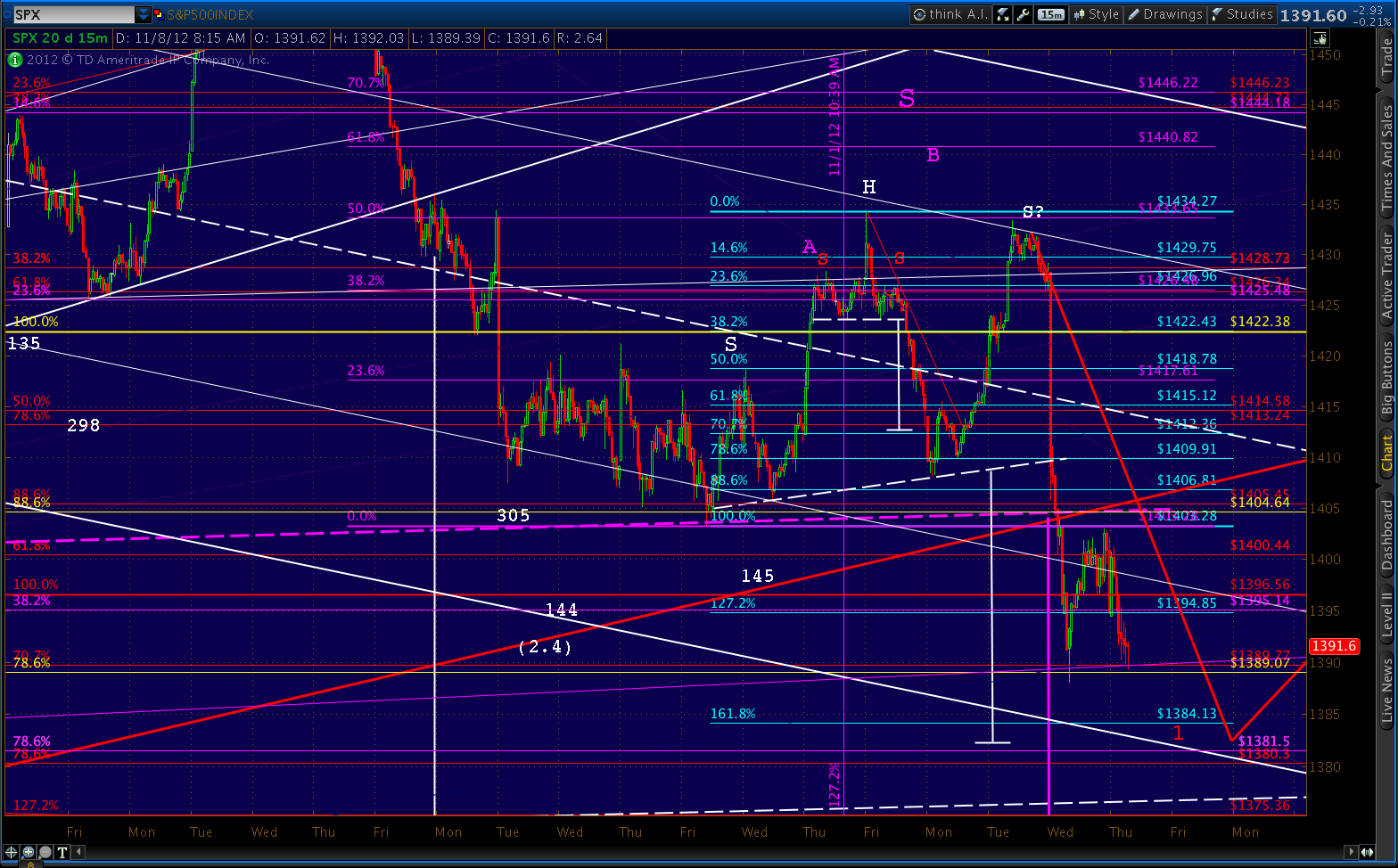We just reached the 1381.50 Fib — the .786 of the 1576-666 crash. I’m closing my shorts here and switching to the long side for an expected ride back up to 1430ish. Trade safe and use stops!