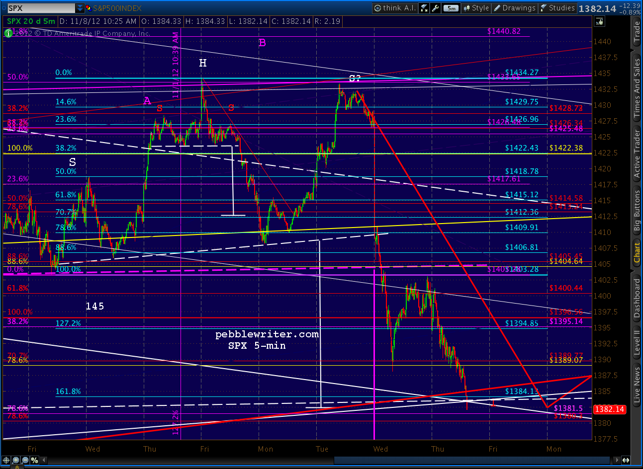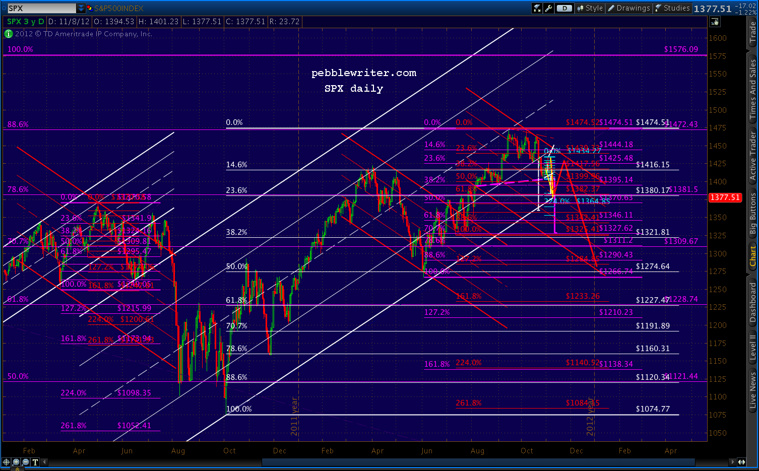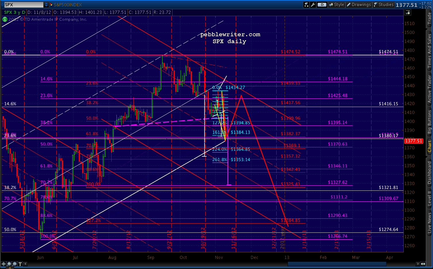 The SPX page is up, and I’ll be updating the rest this weekend [ https://pebblewriter.com/markets/spx/ ]. You’ll find that my Nov 2 forecast was fairly accurate, calling for either 1389 (A) or 1370 (B) by today or Monday.