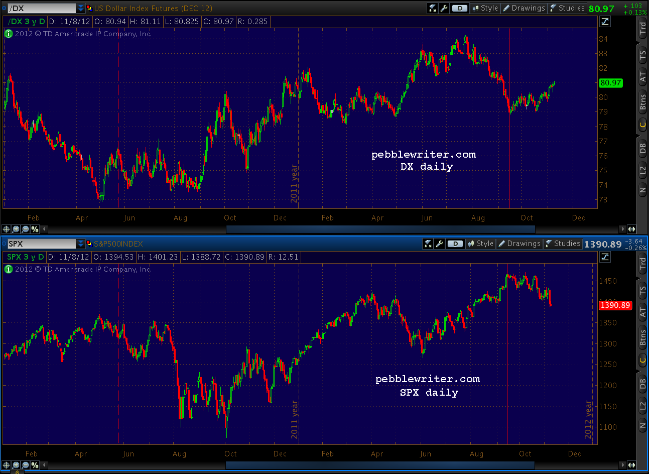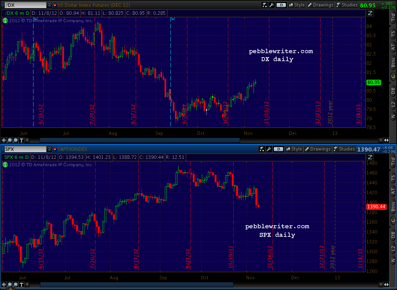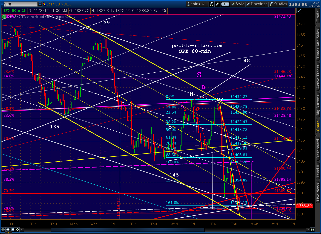 The SPX page is up, and I’ll be updating the rest this weekend [ https://pebblewriter.com/markets/spx/ ]. You’ll find that my Nov 2 forecast was fairly accurate, calling for either 1389 (A) or 1370 (B) by today or Monday.