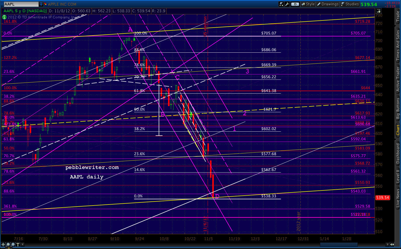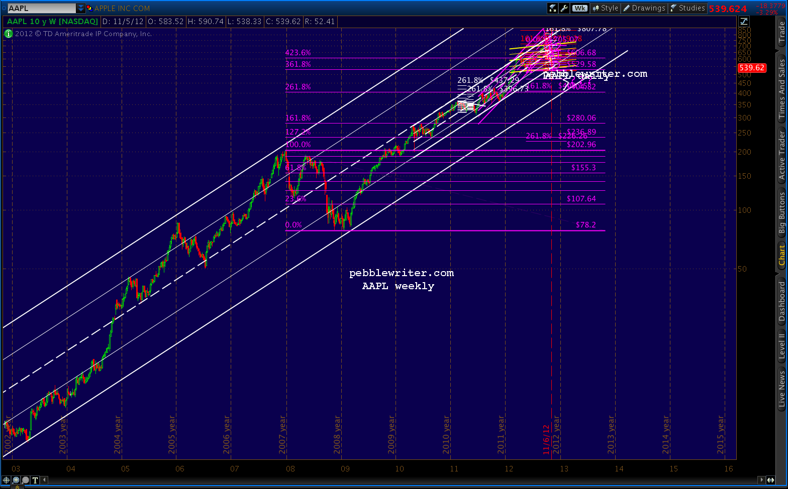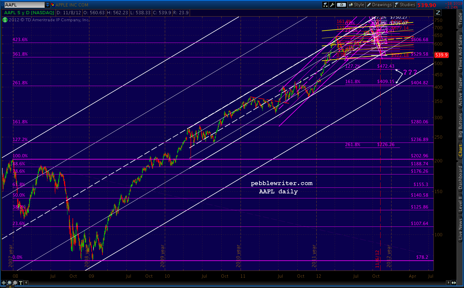 While I think the next big move will be to flesh out the biggest channel — potentially down to as low as 409 — AAPL should get a brief bump higher as SPX does — perhaps to 600 or 620. Of course, if it stalls there, it will have formed 5/6 of a huge H&S pattern that could target 370 or lower. Not saying that’s in the offing, but this is a very scary looking pattern.