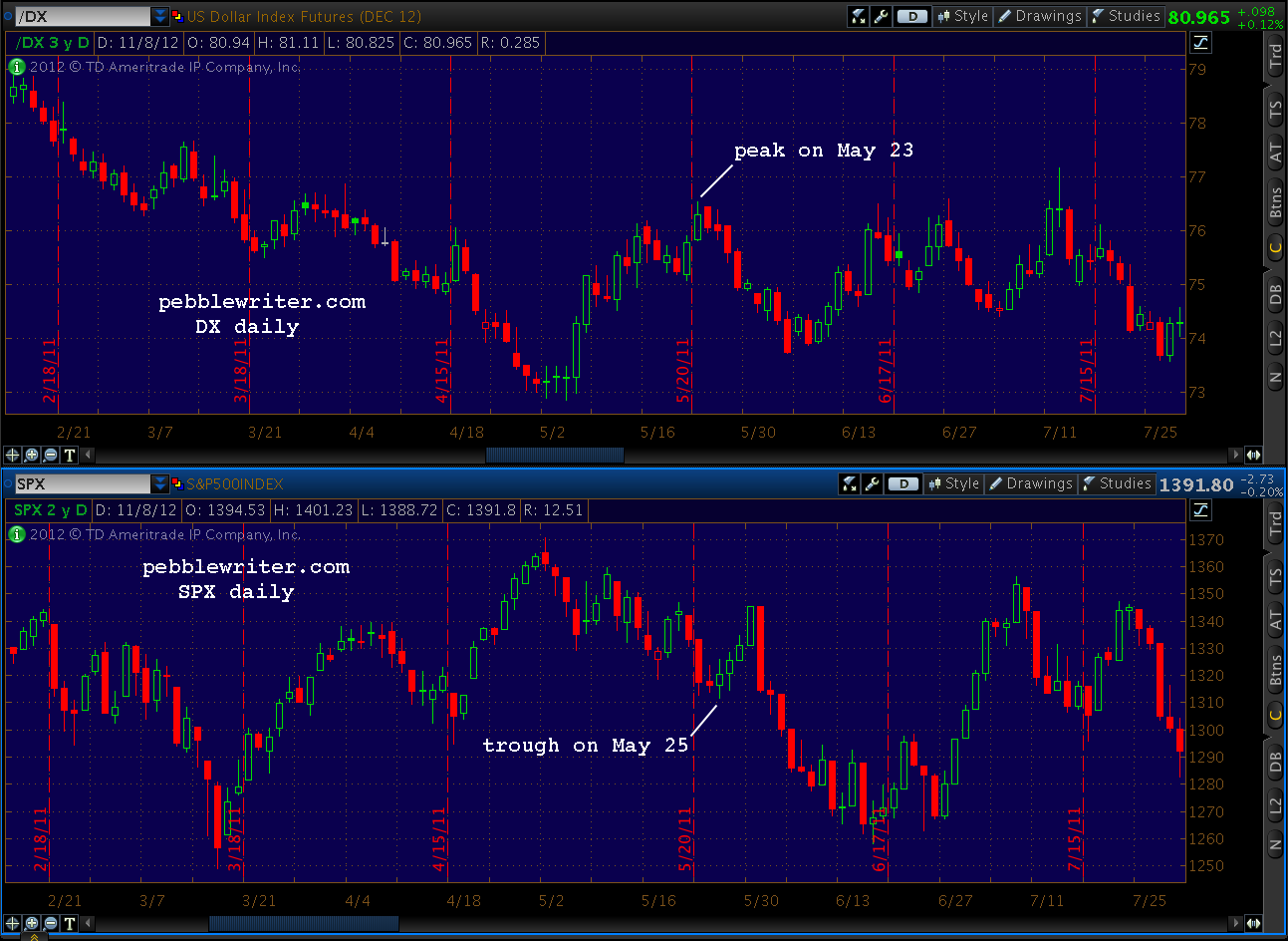 In May of 2011, a spike in the dollar marked the end of the sell-off, but actually arrived just prior to the interim bottom for stocks.