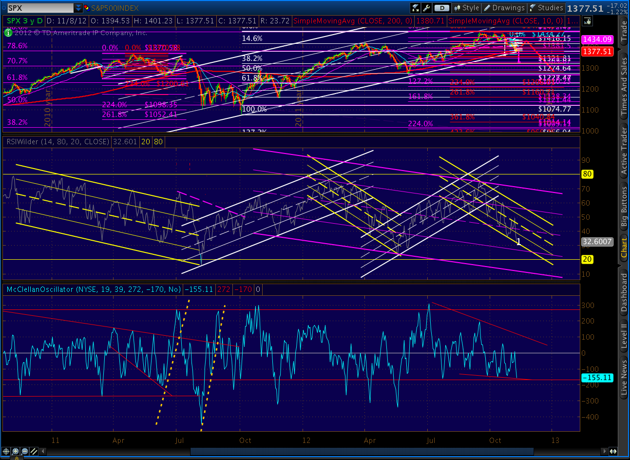 This is essentially the same chart as above — seven weeks later. We’re coming up on the next Fib level lower — the .786 retracement of the 1576 to 666 crash. And, it just so happens that we’re nearing the SMA 200 at 1380.80.