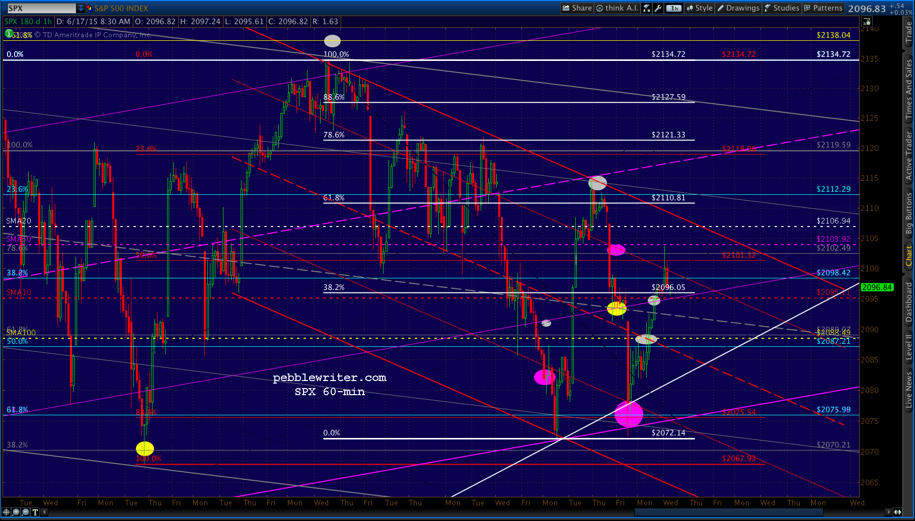 SPX just tagged the SMA10 at 2095.61 — a natural place for a bounce. Conservative types might wish to take the 8 points from this morning’s short and wait to see what the FOMC has in store.