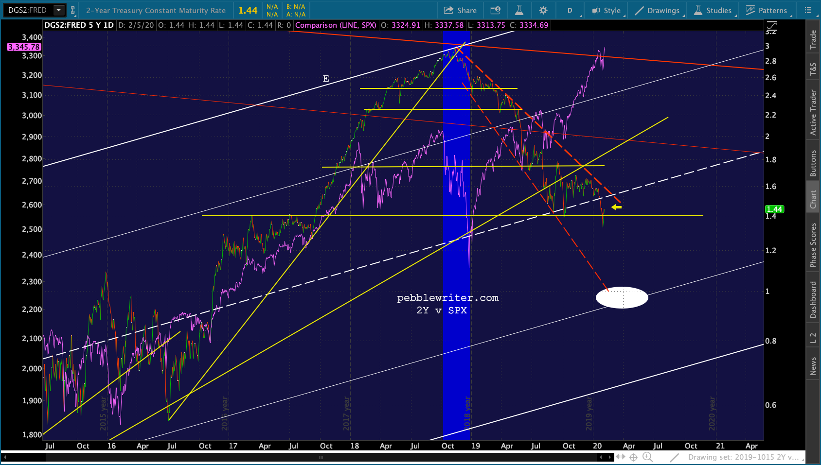 The ES trend line we were expecting to break down yesterday did, in fact, break down. But, it has been a very meek, carefully controlled breakdown so far.