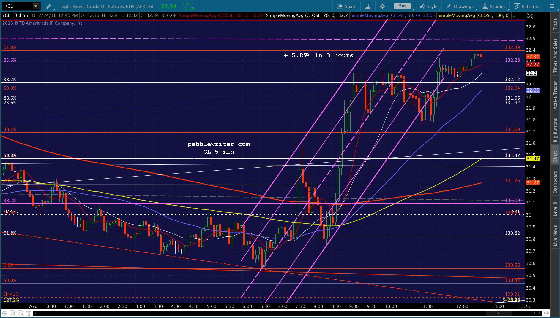 SPX suddenly broke out past the SMA5 100 on CL and USDJPY rejoining their broken rising channels. As chart patterns go, it’s dirty pool. But, not unusual amongst manipulation techniques. I imagine SPX will reach the SMA5 200 by the close. Should get a backtest to the SMA5 100 after tagging the top of the white channel.