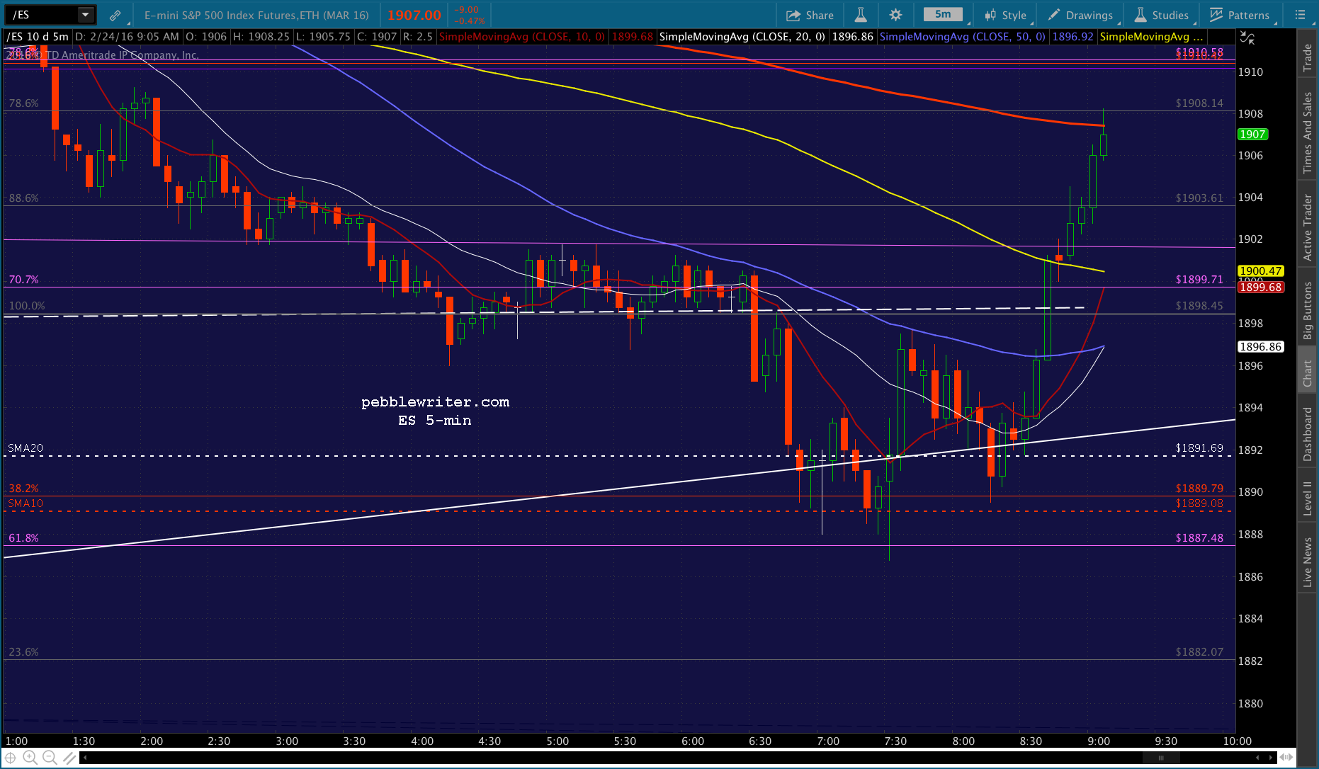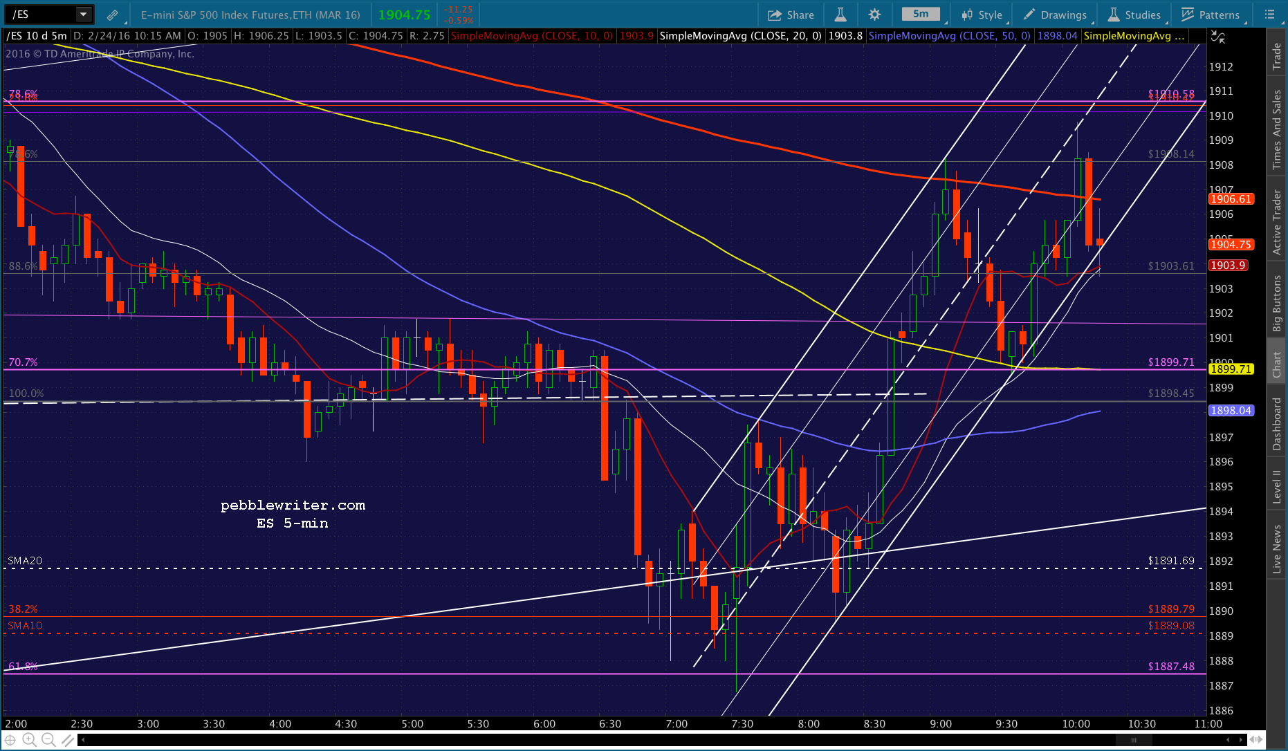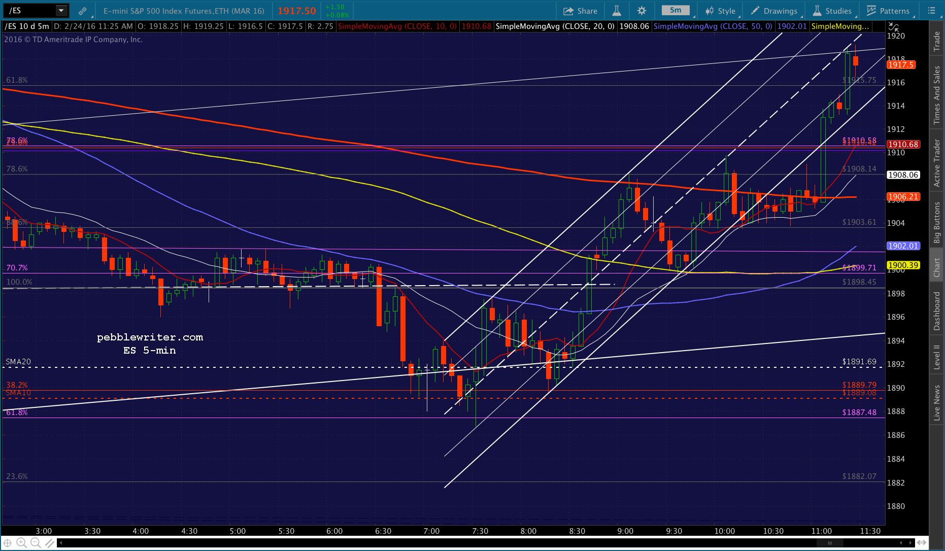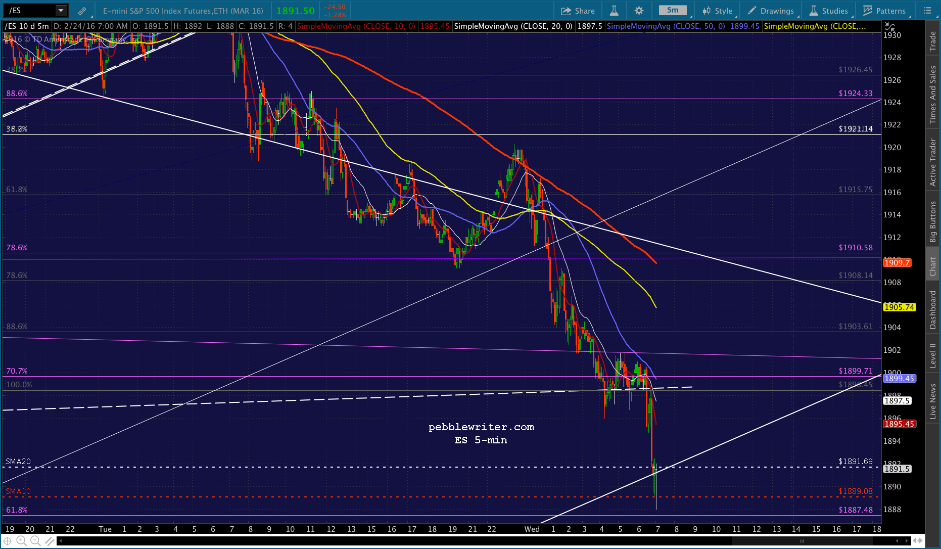 Just pushed through the .382, probably going to test the SMA10 at 1892.27. USDJPY has bounced back above the red channel bottom and ES is about to test its SMA10.