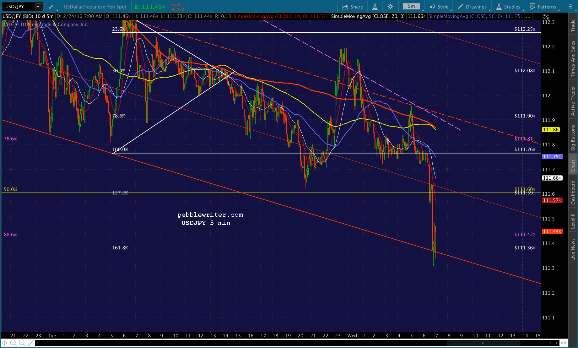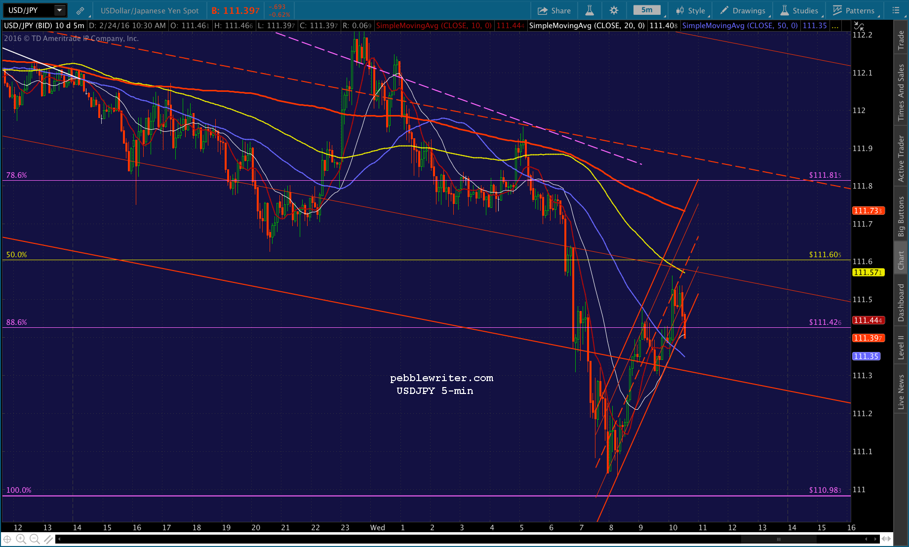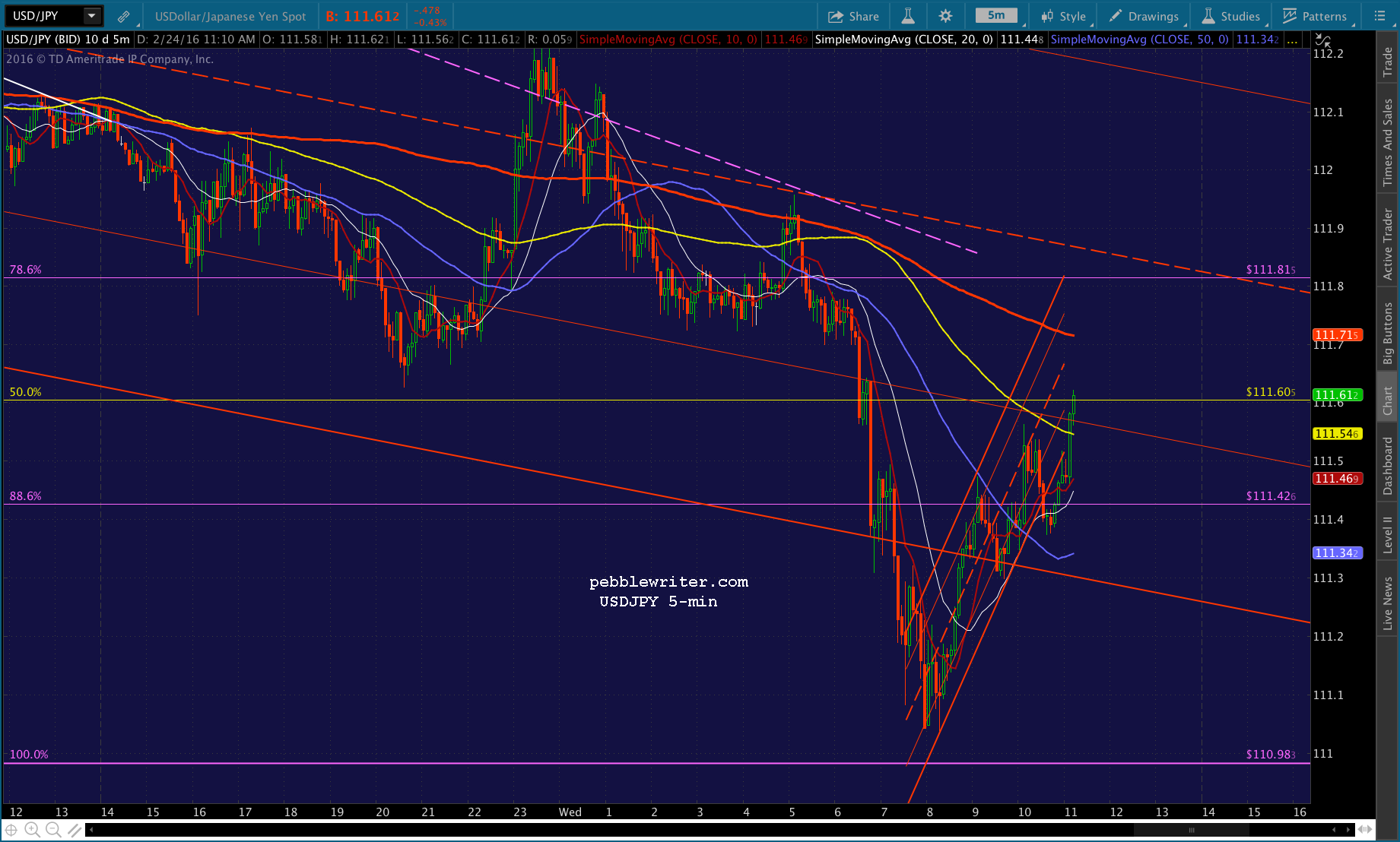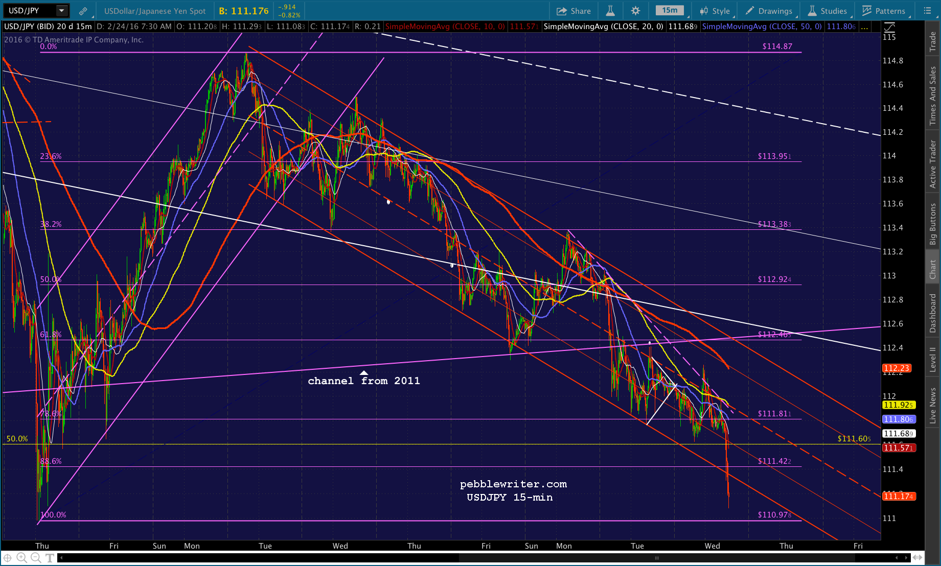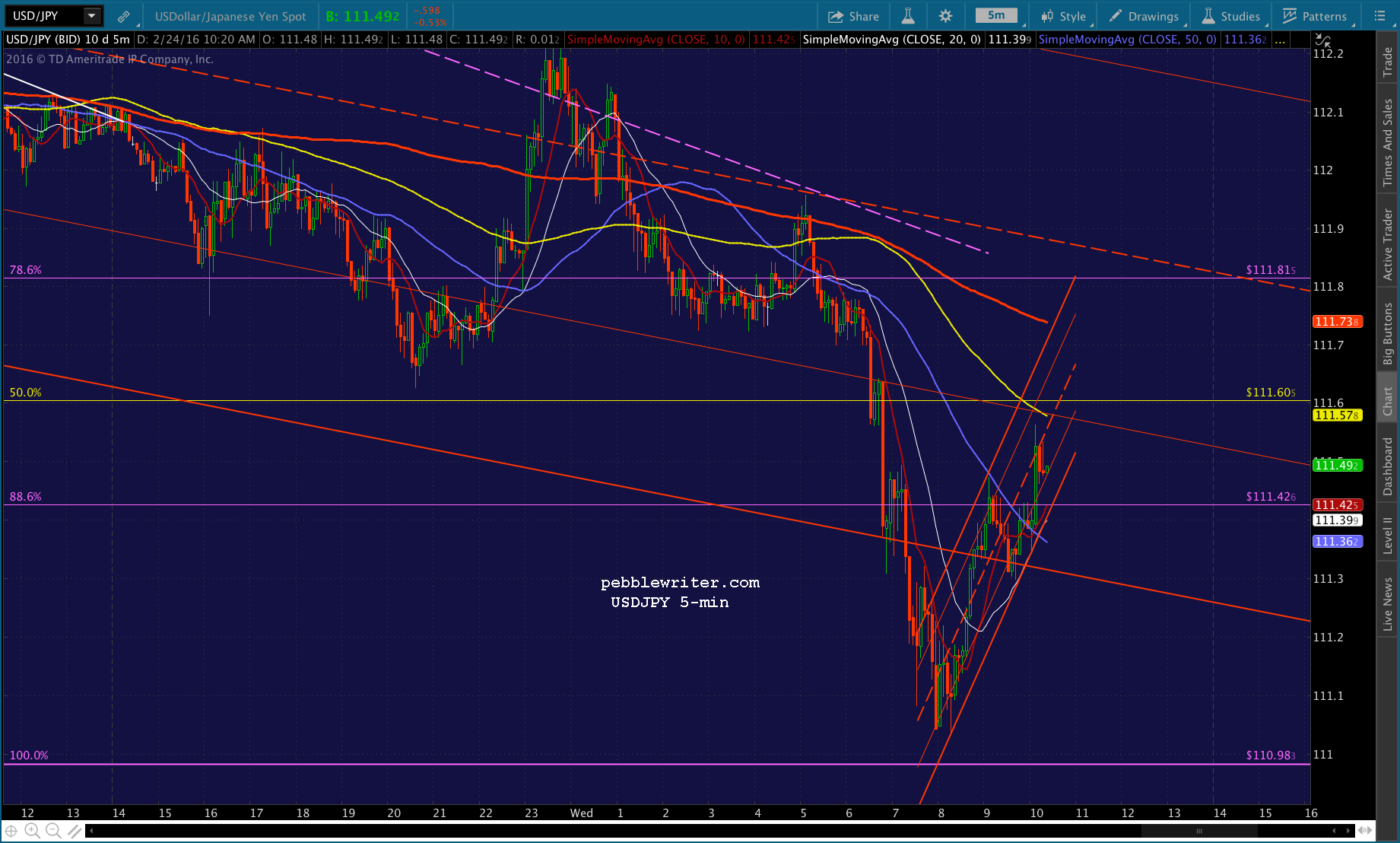 Just pushed through the .382, probably going to test the SMA10 at 1892.27. USDJPY has bounced back above the red channel bottom and ES is about to test its SMA10.