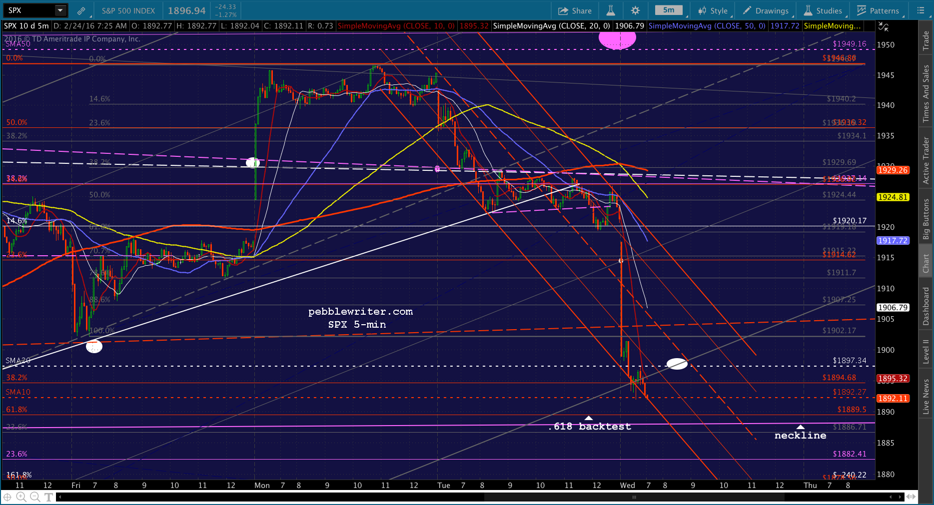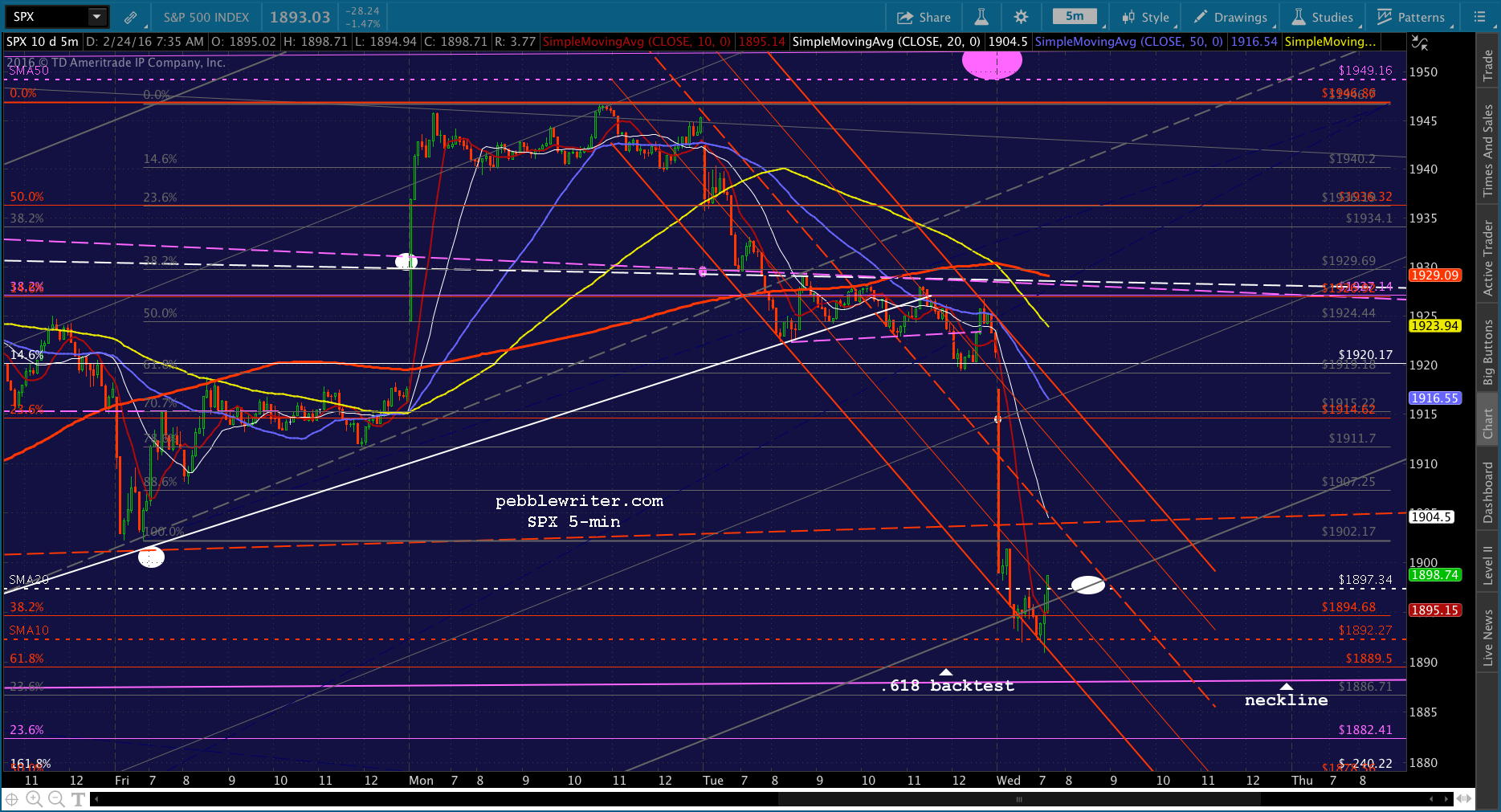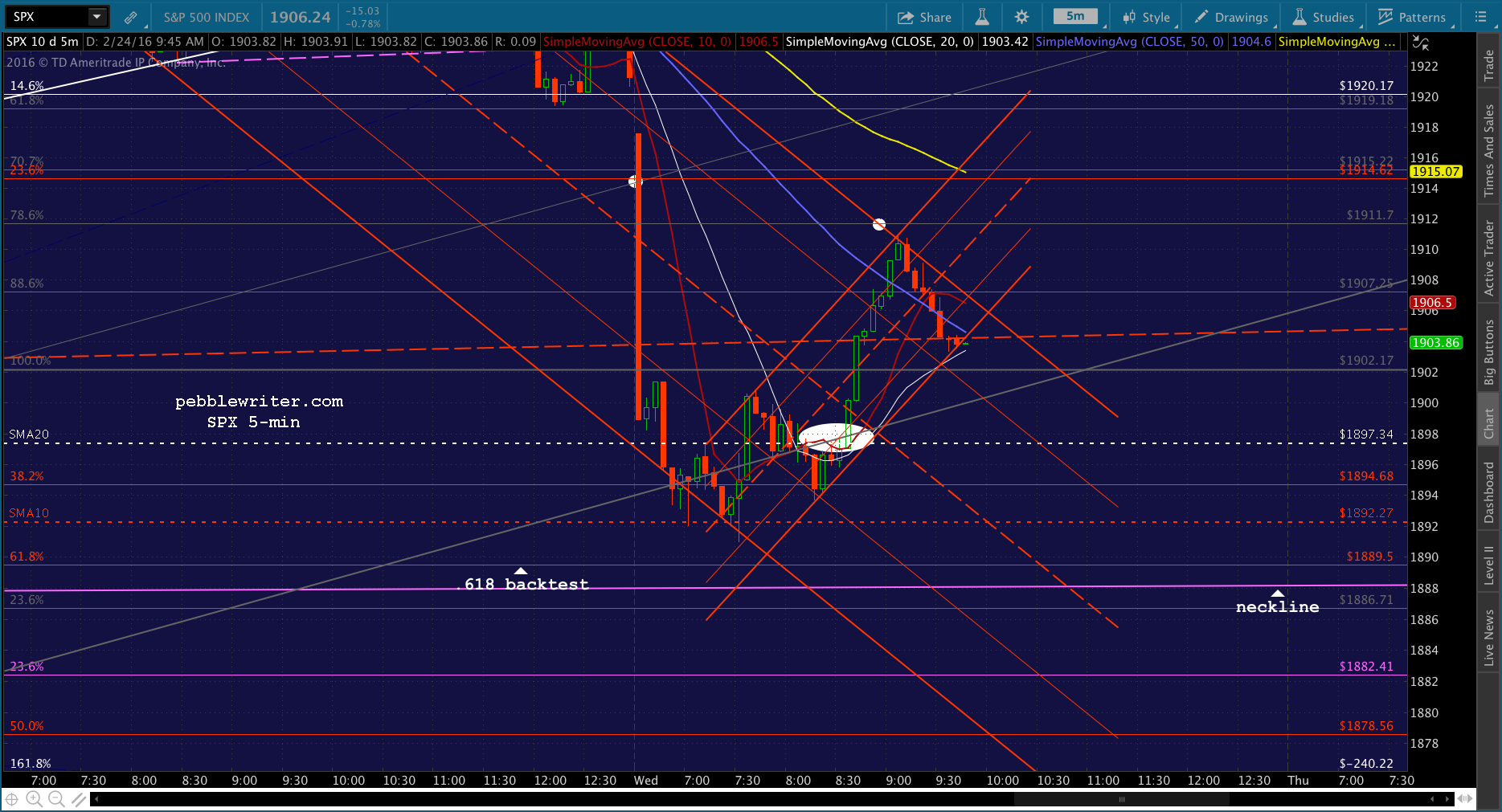 Look for SPX to test the gray .886 at 1907.25. And, should that fail -which is my base case — then the SMA20 at 1897.34 is our primary target.