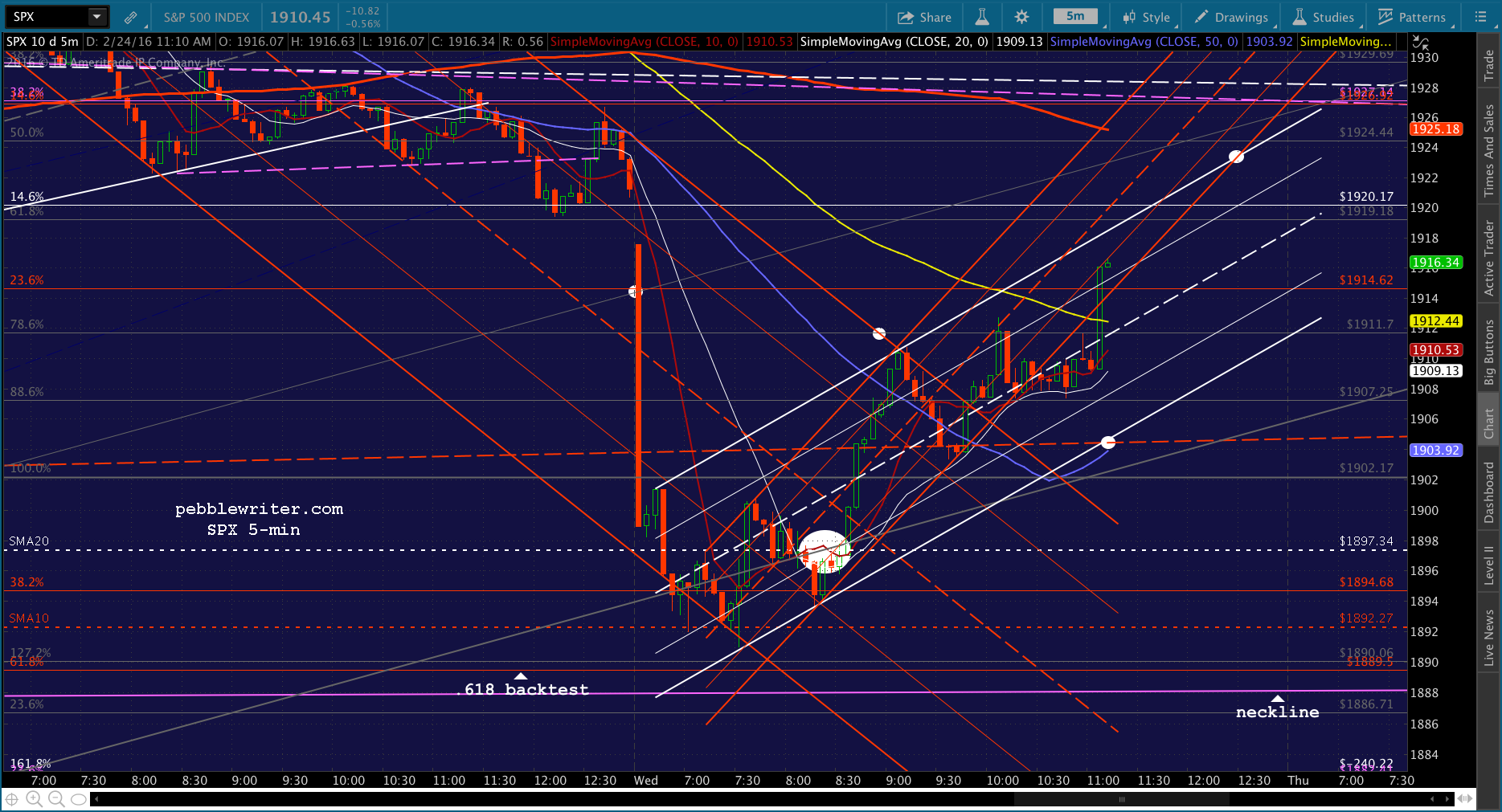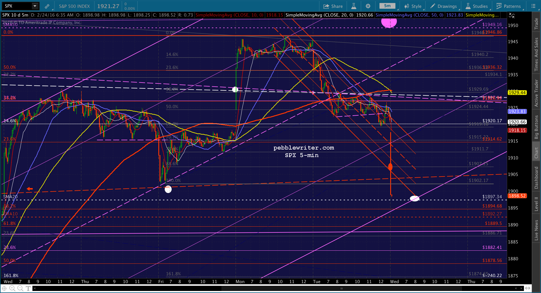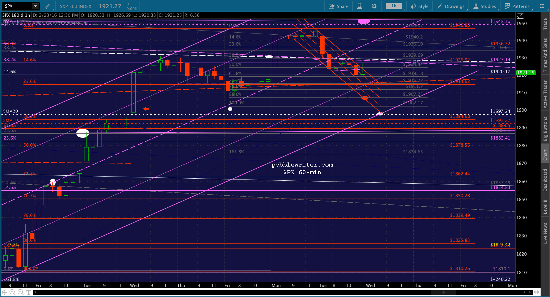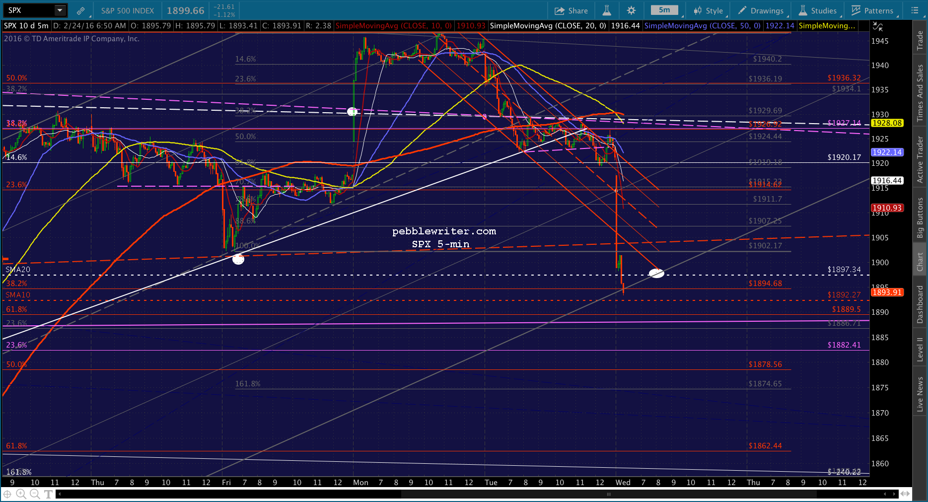 Look for SPX to test the gray .886 at 1907.25. And, should that fail -which is my base case — then the SMA20 at 1897.34 is our primary target.