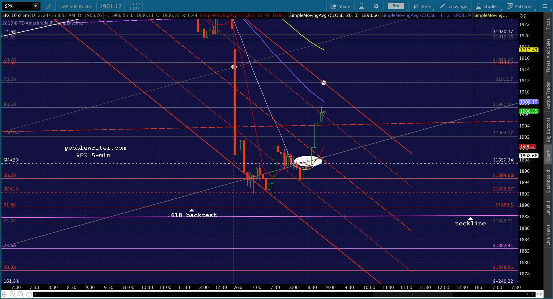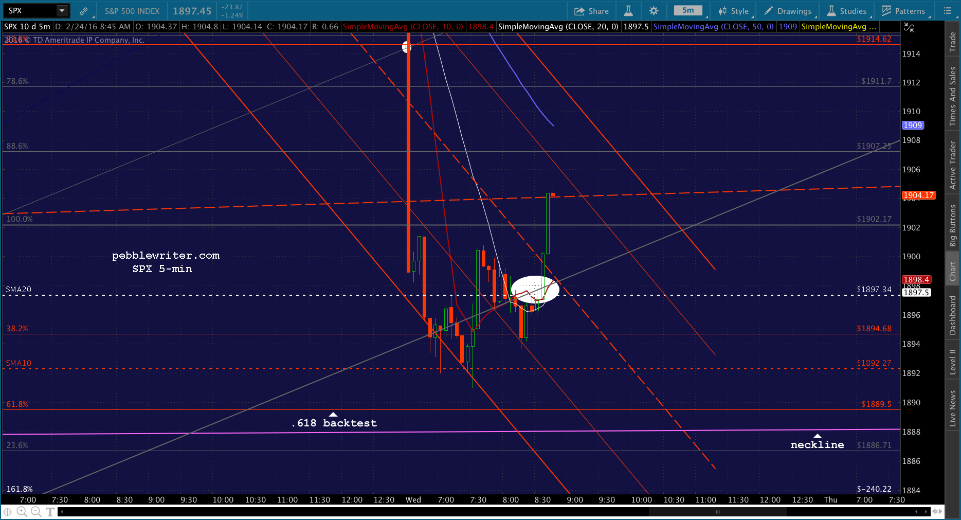 I’m going to cover the short and go long here. If it can get up past the SMA5 10 at 1906.67, it’ll break out of the falling red channel.