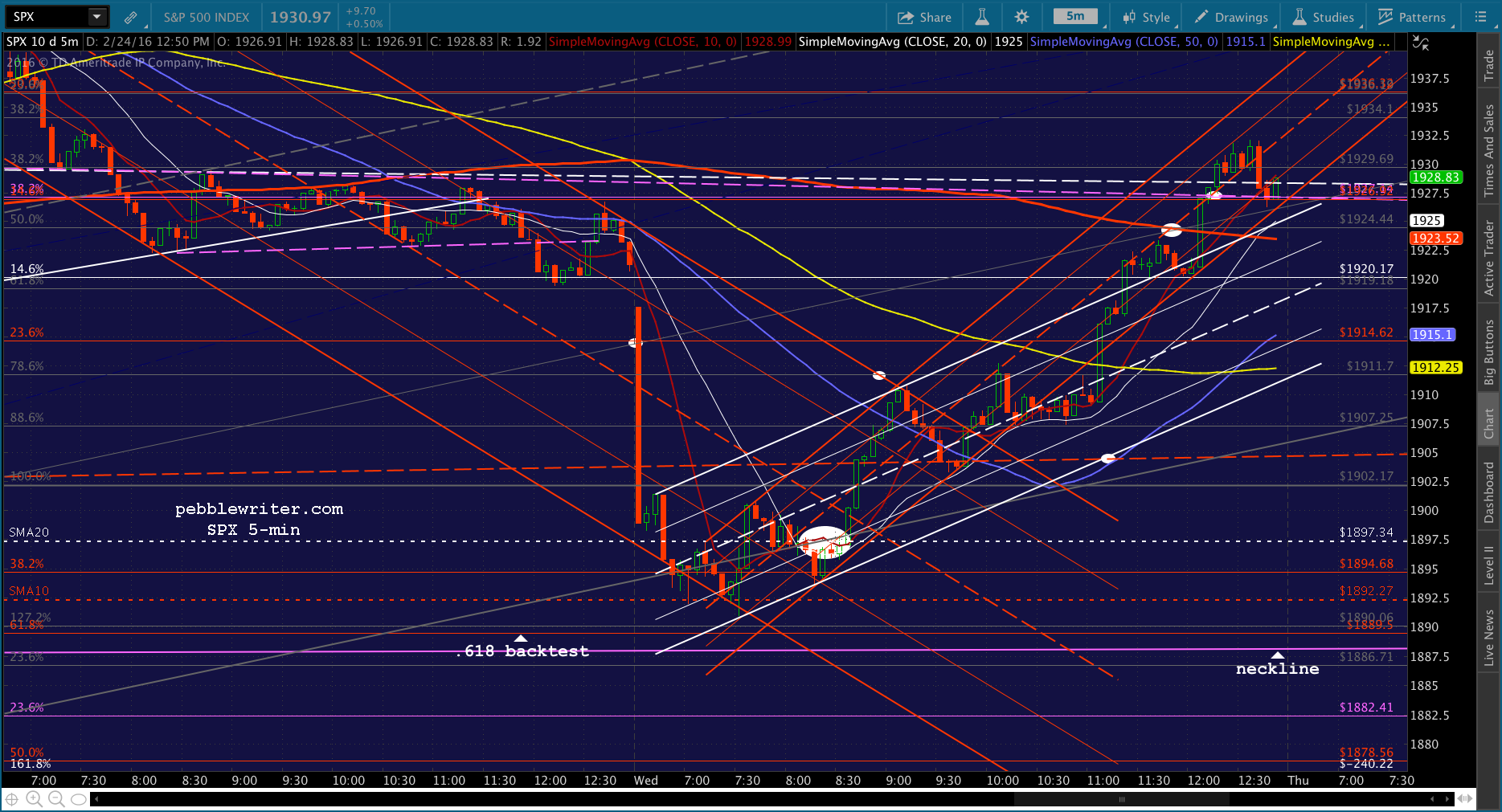 CL finally actually tagged its .618 Fib, so stocks are wondering if the ramp is over now. It probably won’t fall back until after the close — if it does. Shorting here, though I don’t expect it to go anywhere. Maybe the SMA5 200 at 1924?