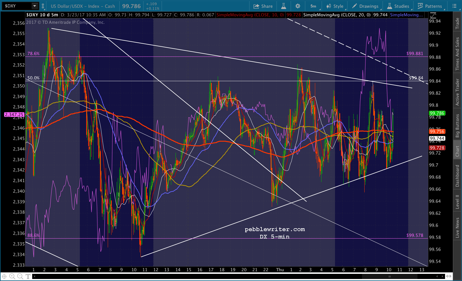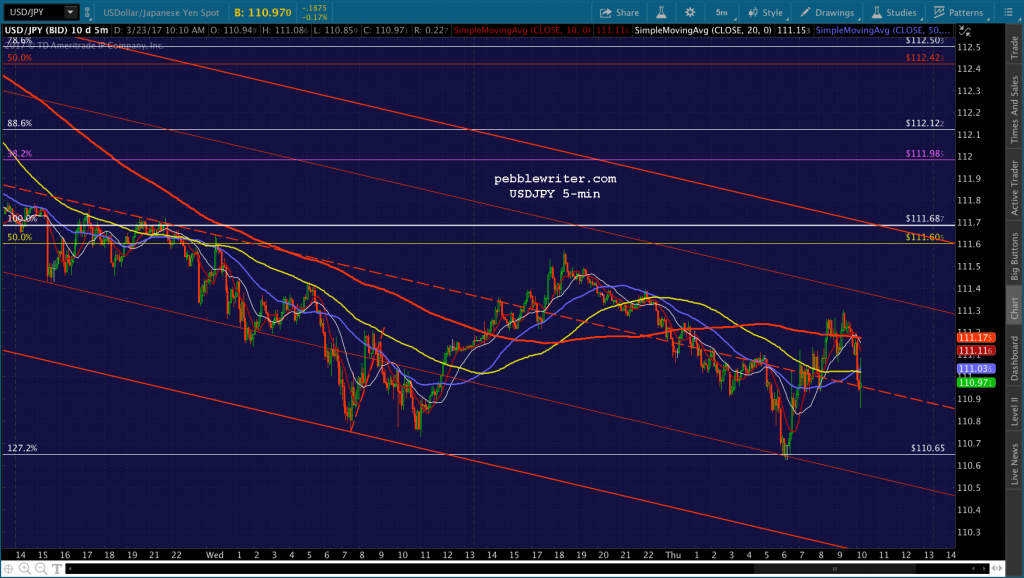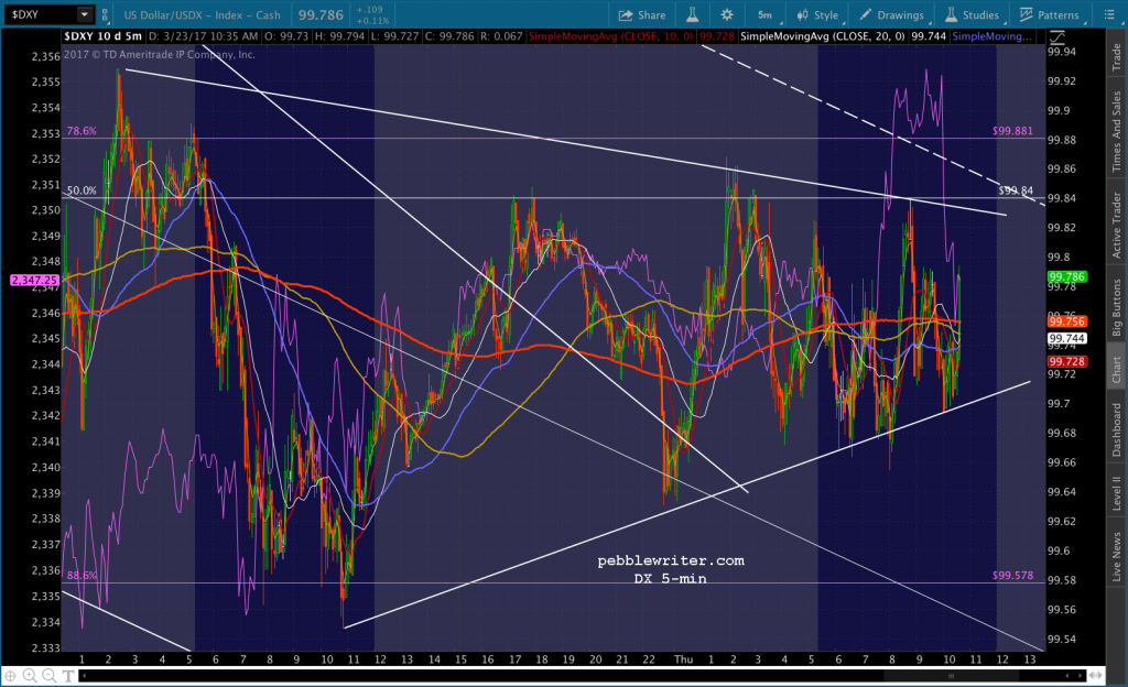 From 2359, SPX has more room to fall before there’s a real problem. Whereas from 2345, there wasn’t as much. I see that USDJPY is ramping — just pushed up past its SMA5 200. And, DX is threatening to break out of a small triangle it’s been in this morning.