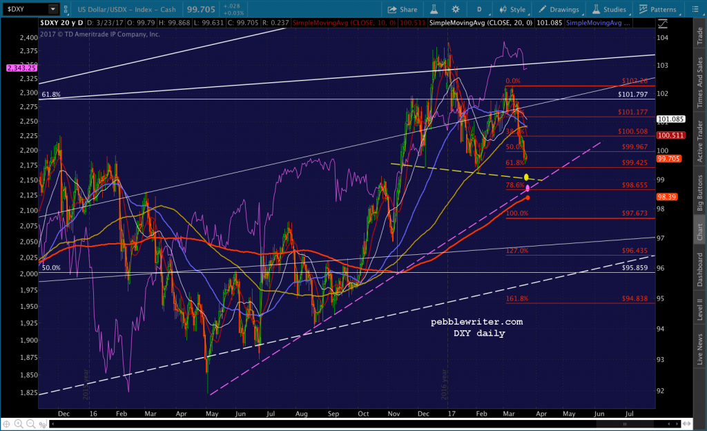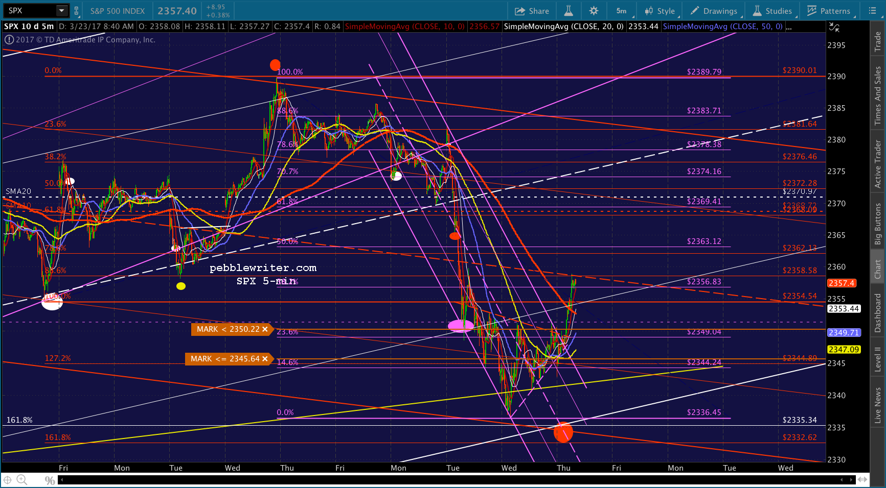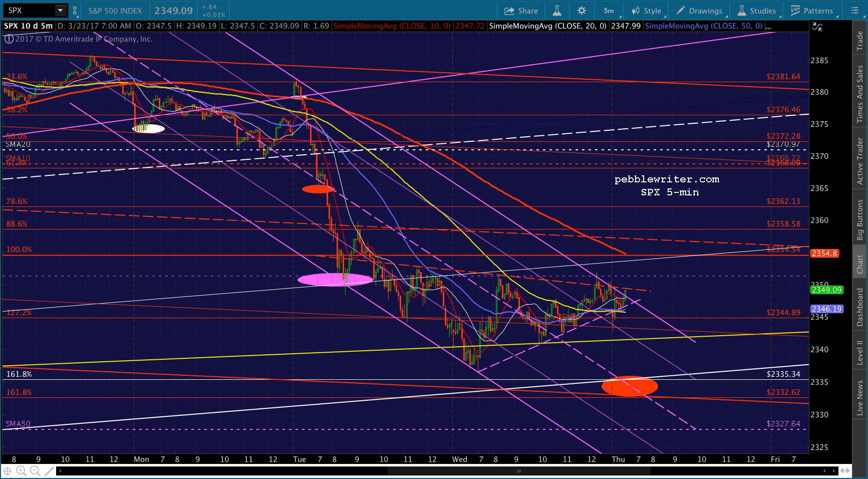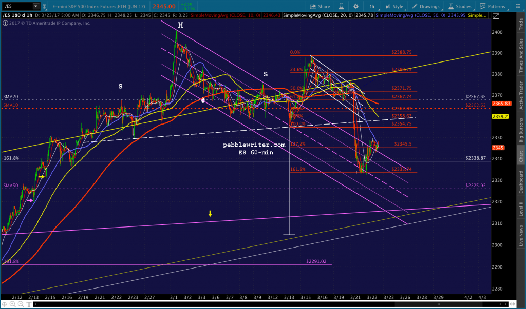 If you want to be real conspiratorial about it, consider the fact that to reach 2335, now, SPX would be backtesting the falling white channel at the end of the day. TPTB could even blame it on the AHCA falling apart or some such rubbish.