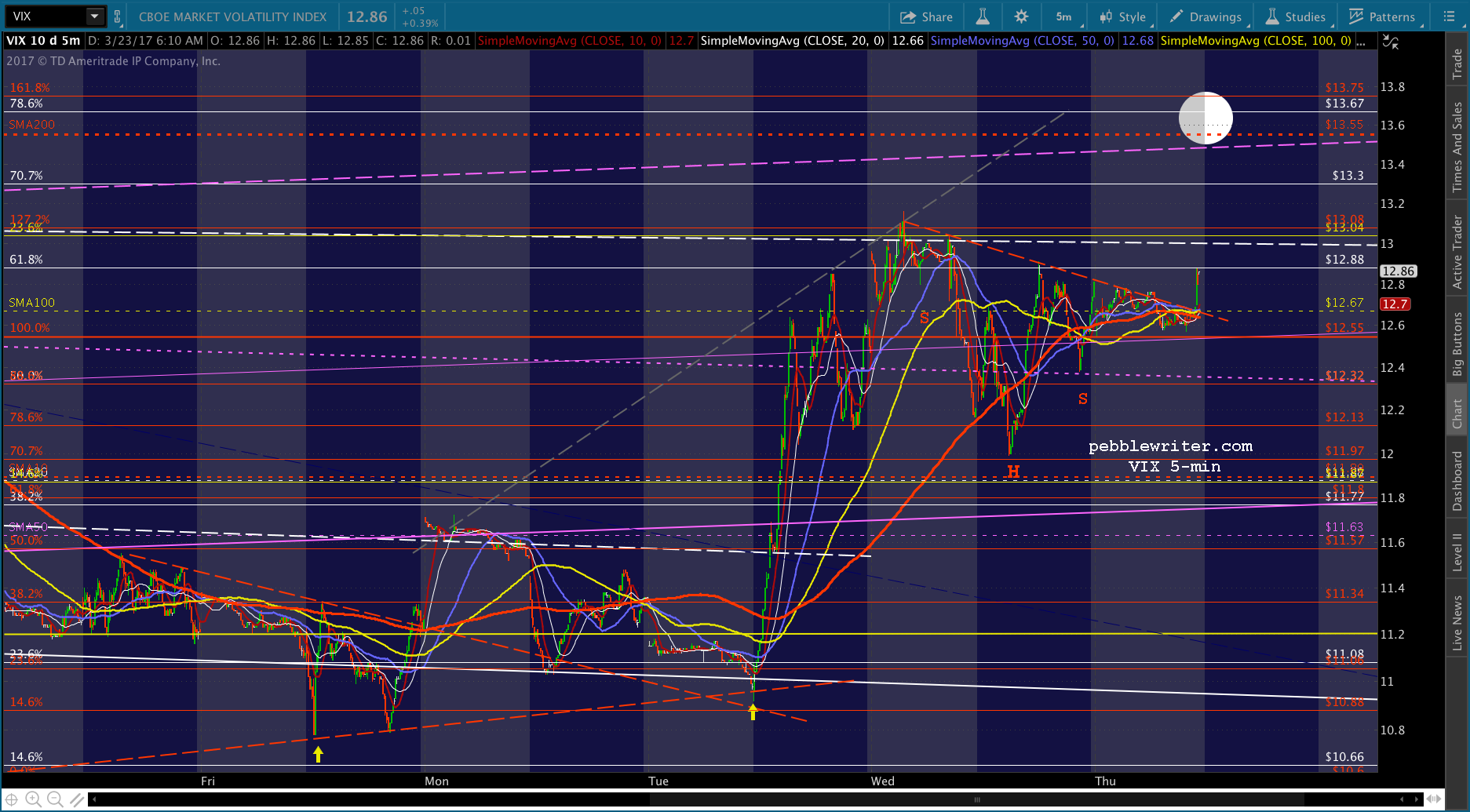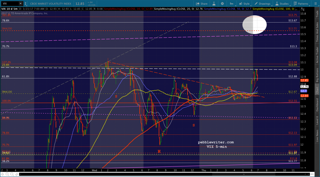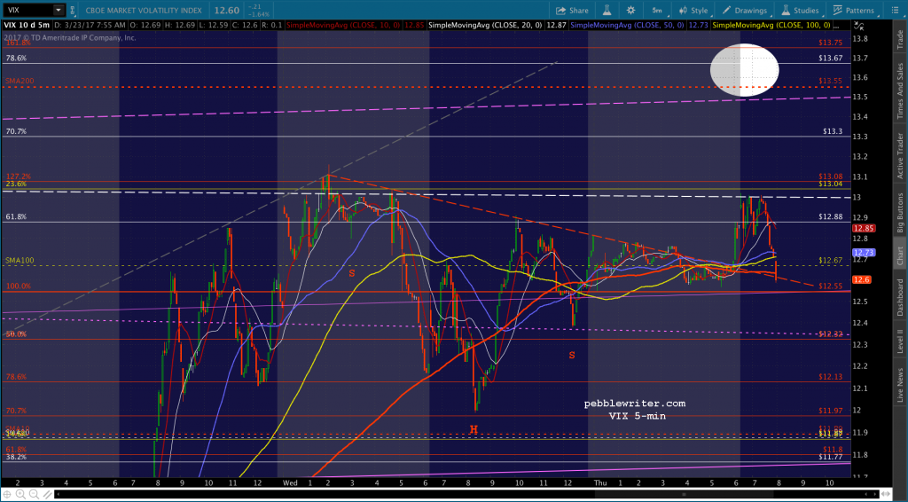 There’s the SMA5 200 tag, courtesy of VIX backtesting its ST SMAs. If it’s going to reverse, we should see VIX rebound from 12.73. If they want it to break out, VIX will break down some more. I’ll take a stab at shorting here with very tight stops.