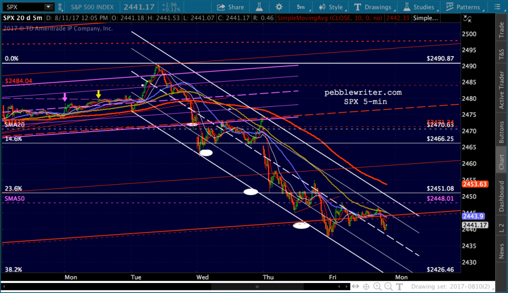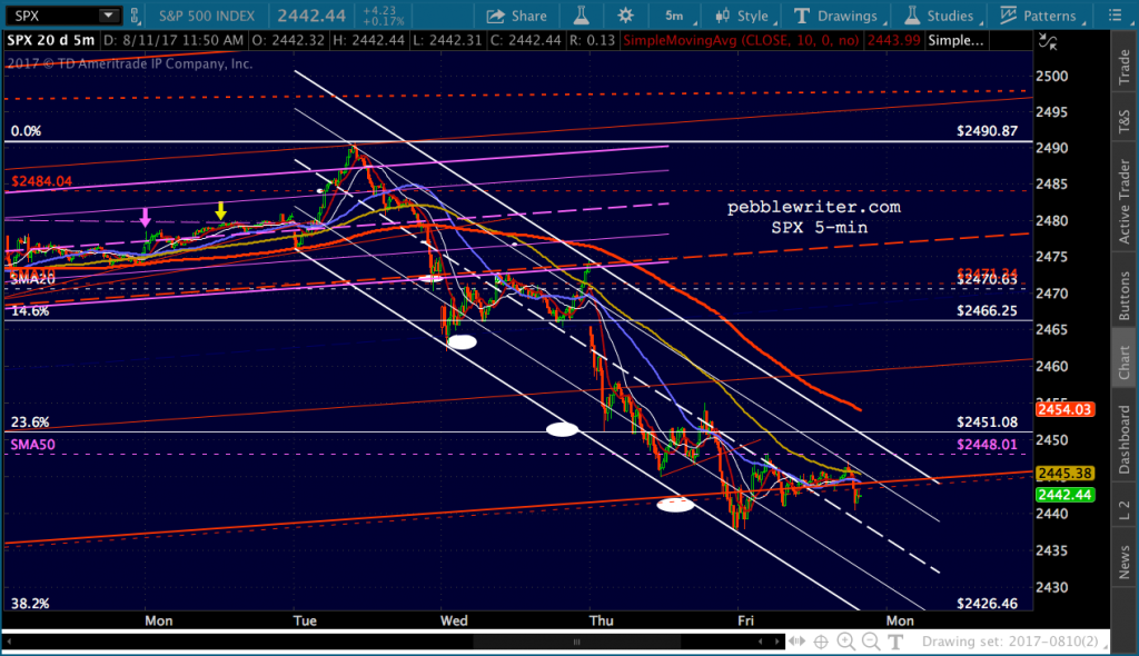 The prognosis is pretty clear today, remain long as long as SPX remains above the bottom of the rising red channel (2438ish.) Otherwise, don’t be bashful about shorting.
