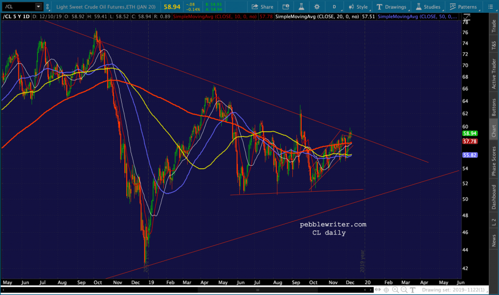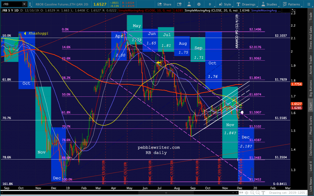 Remember, this is if TPTB wish to keep CPI at or below 2.0%. Keeping inflation steady at 1.84% in December would imply gas prices around 2.19, which in turn would imply RB of 1.37 to 1.51. A return to CPI of 1.71% would mean 2.09 gas and 1.27-1.40 RB (not since 2016.) And, of course, this exercise assumes all else is equal – which will almost certainly not be the case.