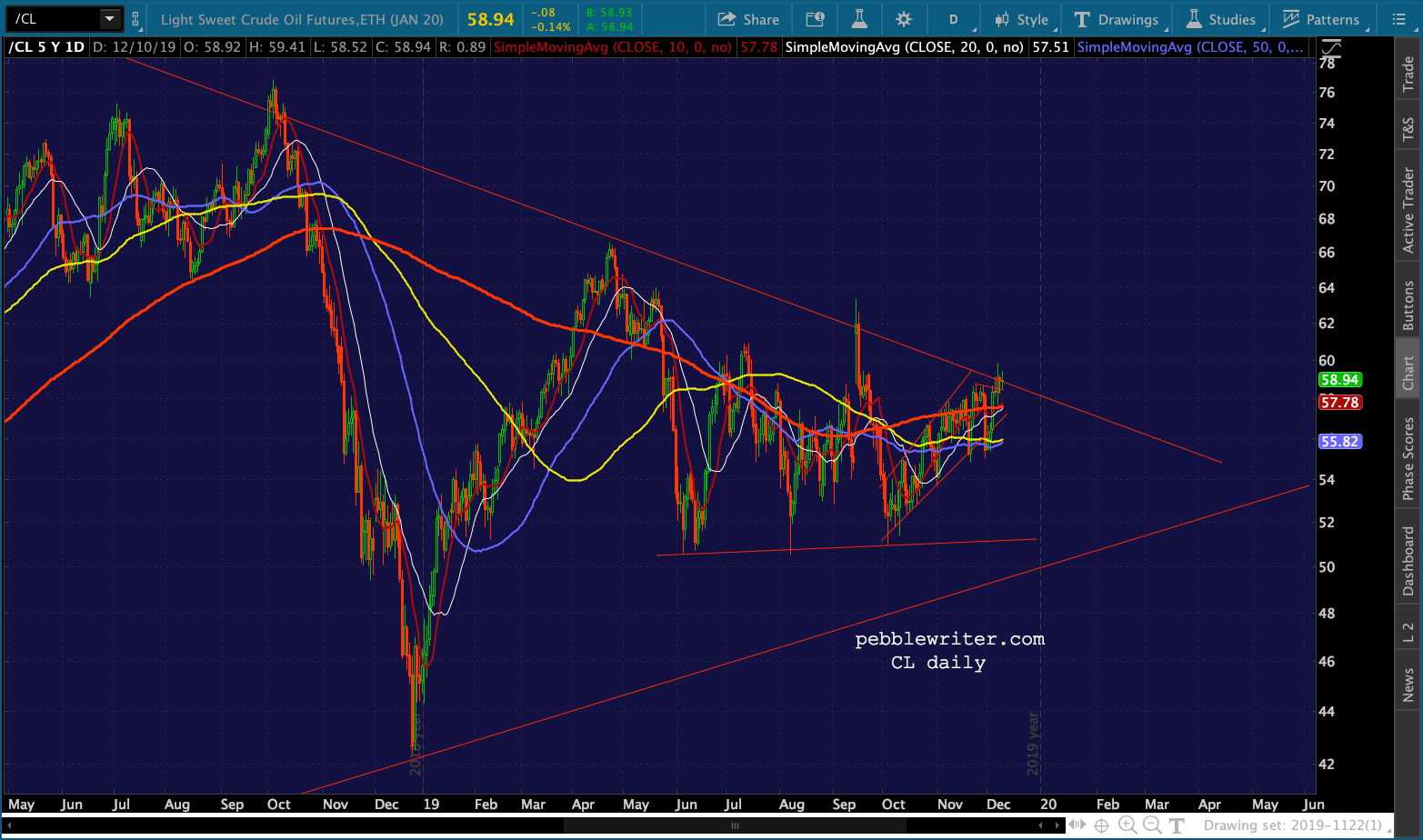 CL is a slightly different animal. Though, it’s safe to assume that a 19% drop in RB would equate to 47.55 – 49.46 in CL. However, there is a chart pattern that I’ve been studying for the past several months which promises much bigger moves in a longer time frame. More on that tomorrow.