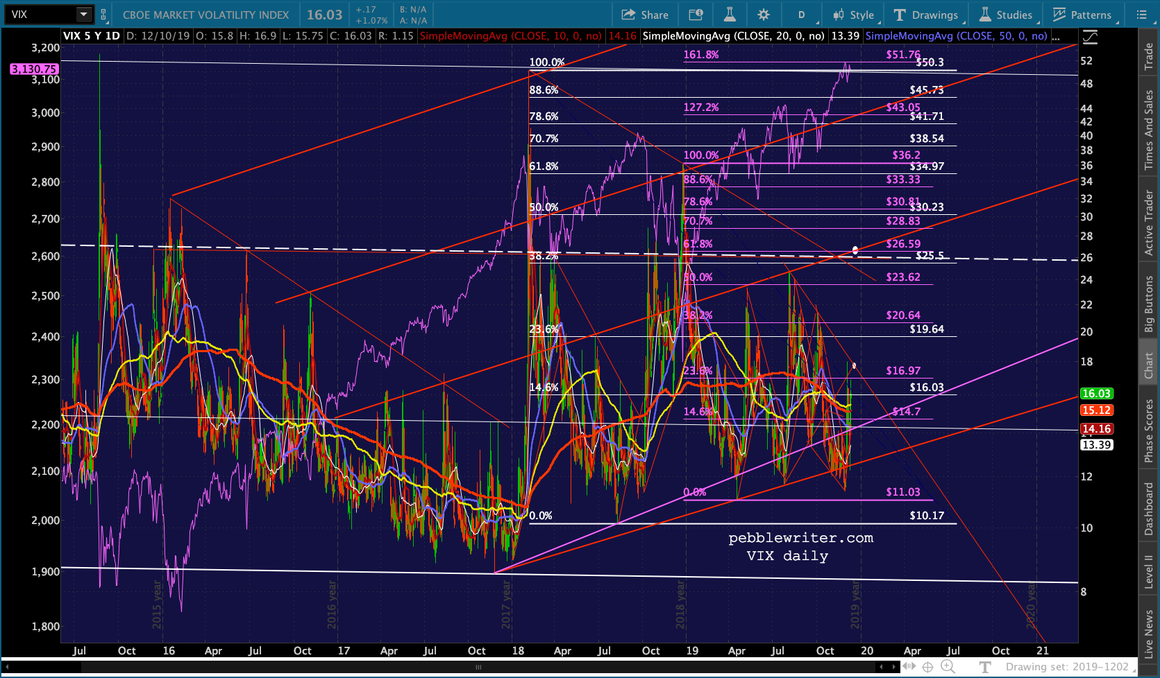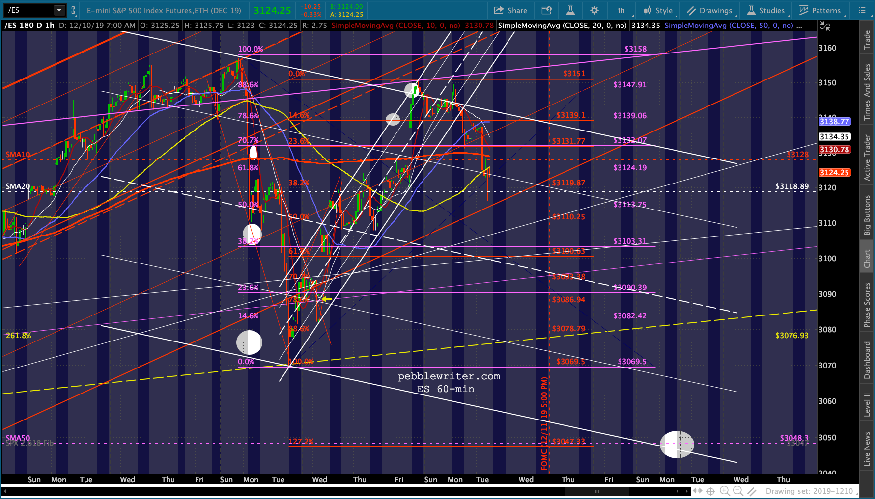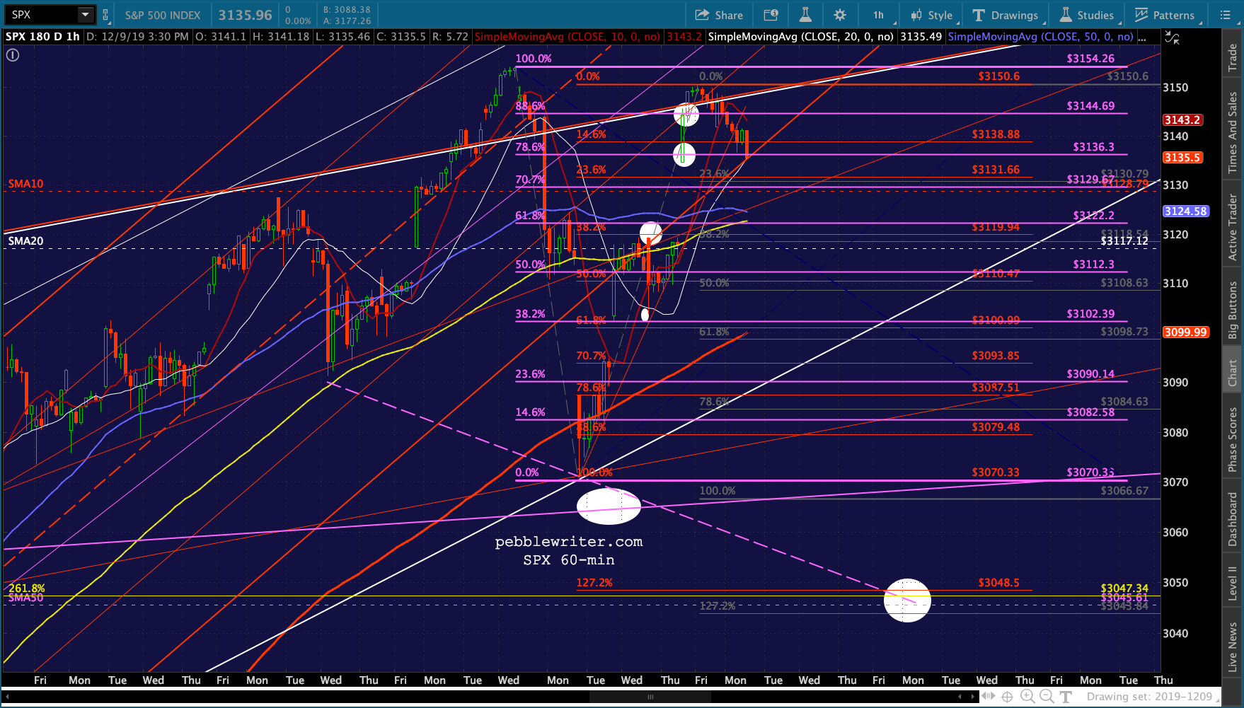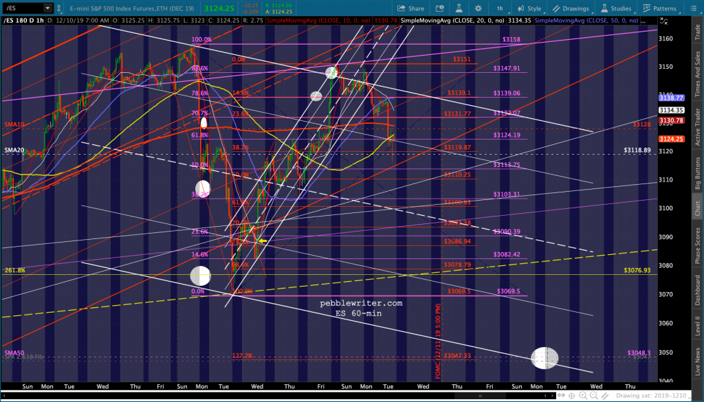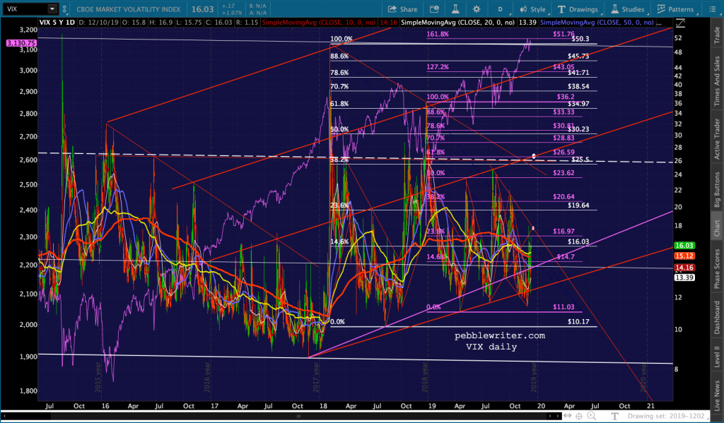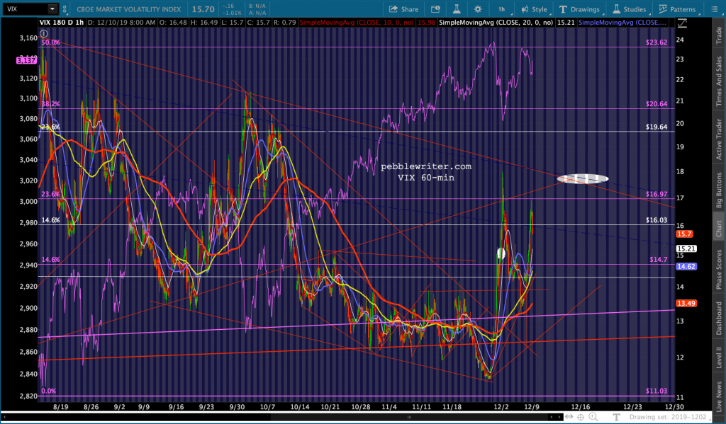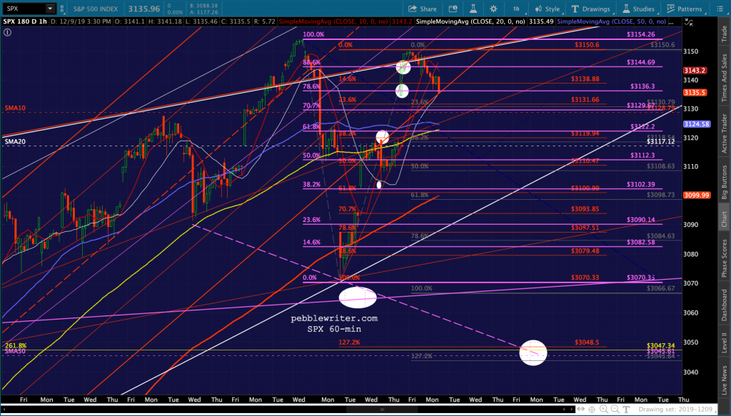 continued for members…The bigger picture shows things lining up nicely for a Dec 16 drop to SPX 3047. SPX closed at the bottom of the rejoined red channel. But, note that the 1.272 extension of the red grid points to 3048 – right on top of the 2.618 at 3047.34. The C=A target lines up at 3044.