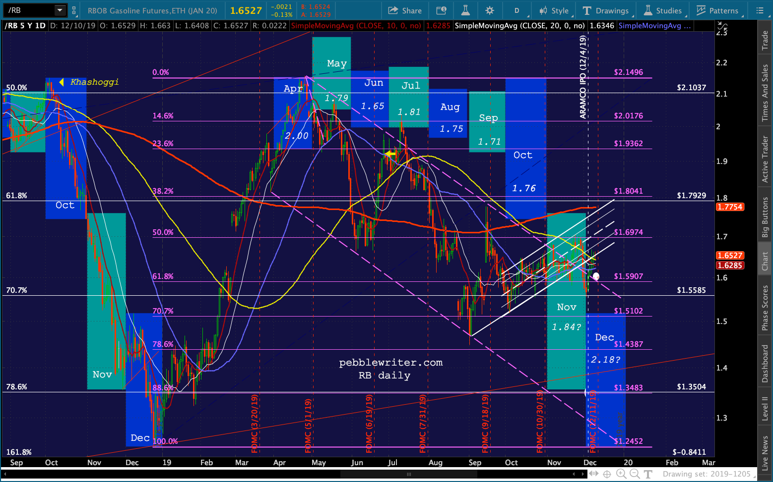 So, what is likely? I think the sweet spot is 1.8 – 2.0% — about 2.16-2.33 in gas and 1.37-1.52 to 1.37-1.48. Combine them and you get an average gas price of 2.145 and RB of 1.40. Since we’re talking averages, this would comfortably allow RB to decline as far as 1.35, which is the purple .886 and white .786. Any drop through this level would run into the yellow .707 at 1.30, the former low at 1.25 and the yellow .786 at 1.19.