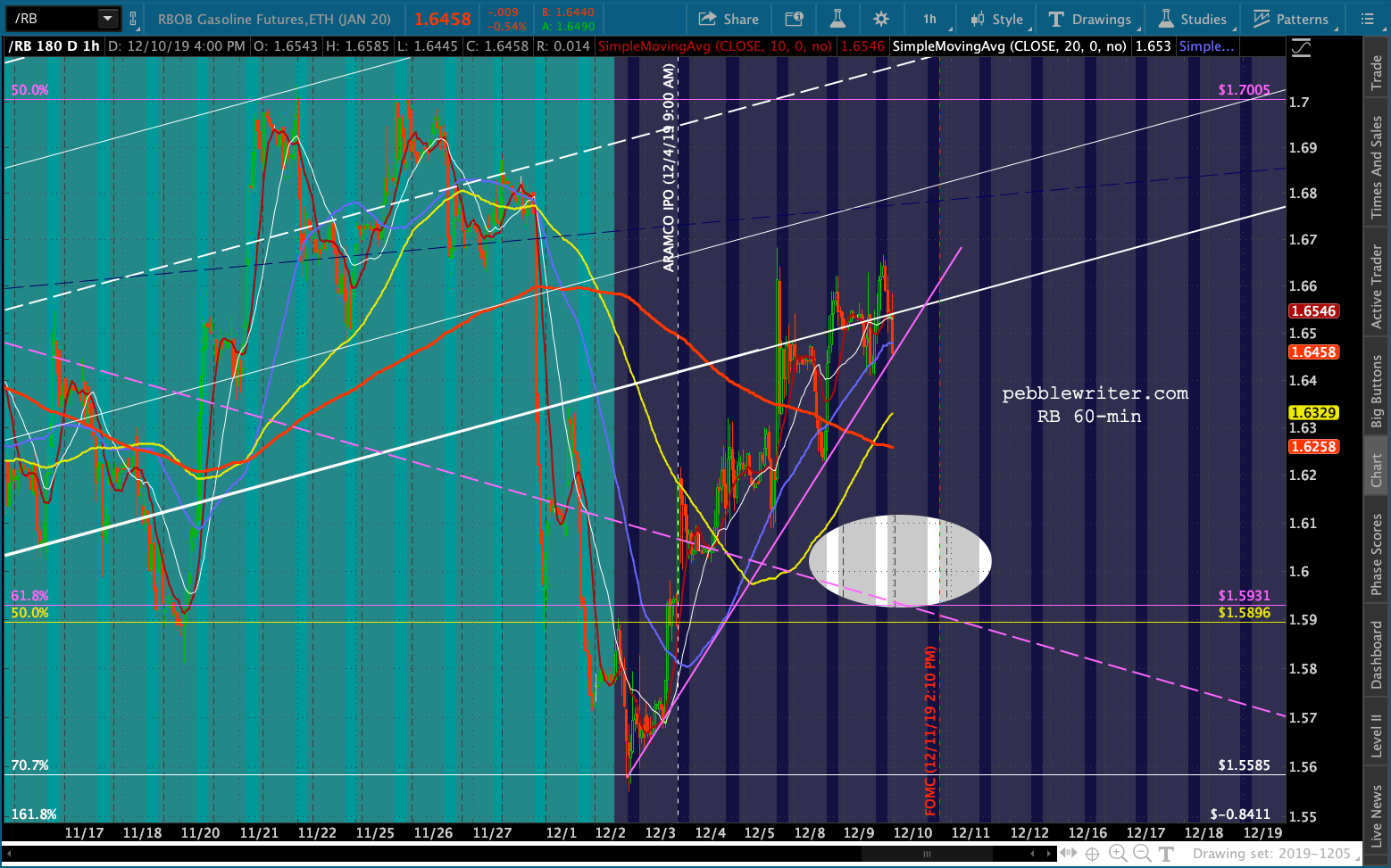 A more legitimate approach might be to look at where RBOB was when EIA reported prices near 2.335. The best example would be early December 2018, when EIA reported weekly data of 2.35 and 2.325 (the last two weeks dropped to 2.268 and 2.216.) As we can see from the chart below, early December in RB ranged from 1.37 to 1.52.