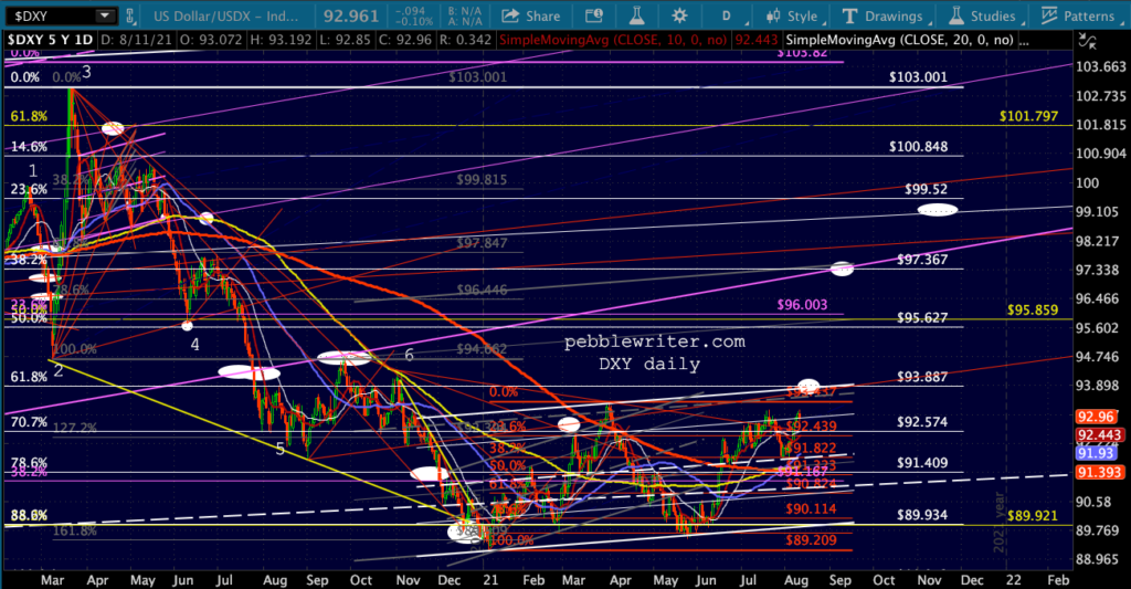 We’ll want to watch DXY closely as it approaches the white flag pattern top at 93.89. A breakout to the 97.37 target would almost certainly coincide with an equity correction.