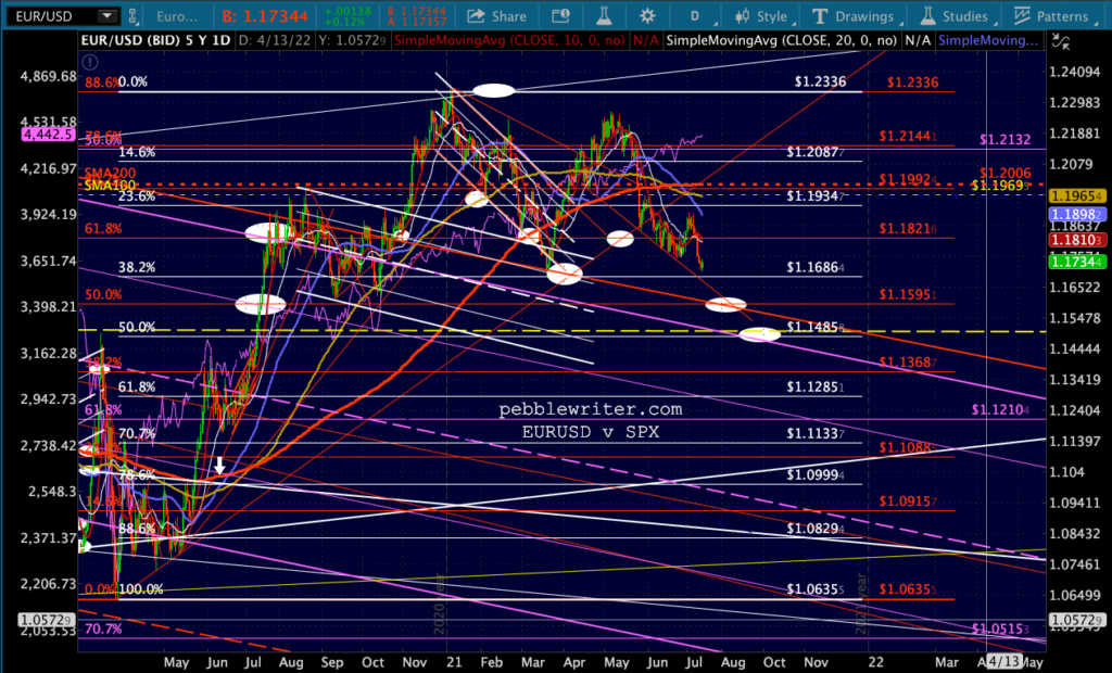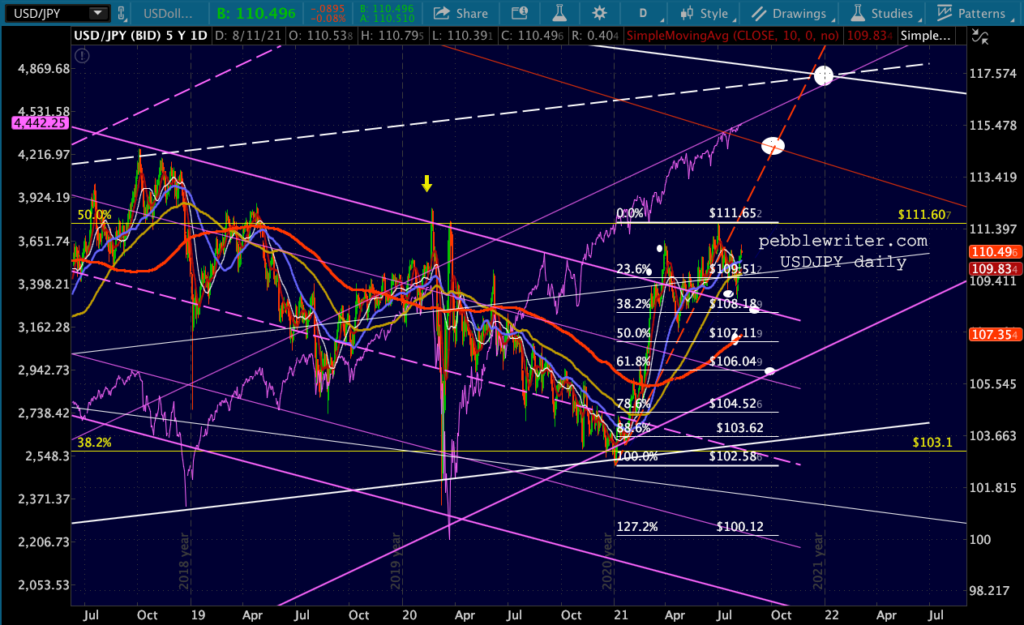 We watch USDJPY very closely as its movements offer great insight into the thinking of central banks. Currently, it’s bouncing. But, I continue to expect another leg down – presumably to backtest the falling purple channel again as the SMA200 emerges from it in Sep-Oct.