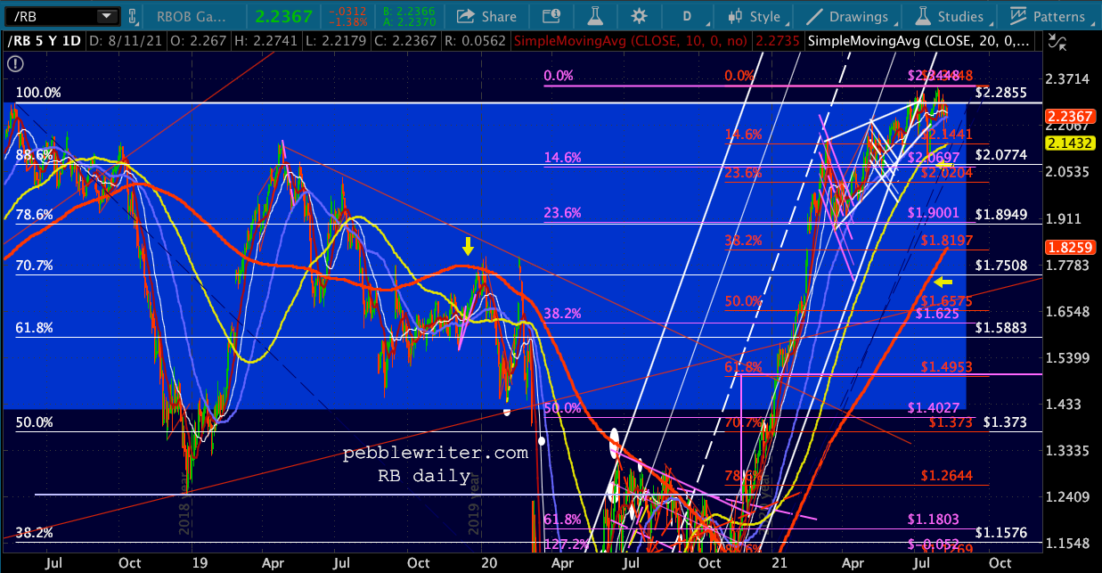 As we’re previously pointed out, CL is at the upper bound of a falling channel from 2008 and RB is at the upper range of the last seven years of price swings. Both are pushing the Oct 2018 highs – the last time a president called on OPEC to increase production due to inflation being too high. For those not already short, this is another reminder…
