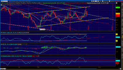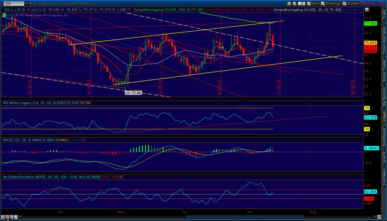 Watching the /DX, which fell pretty hard during BB’s comments. It seems to have been an overreaction to the possibilities of QE3. We went down and tagged the 10, 20 and 50 SMAs, are bouncing back now. I continue to think we’re backtesting the falling wedge breakout and will see the move up continue to at least the 77.5 area by the end of the week.